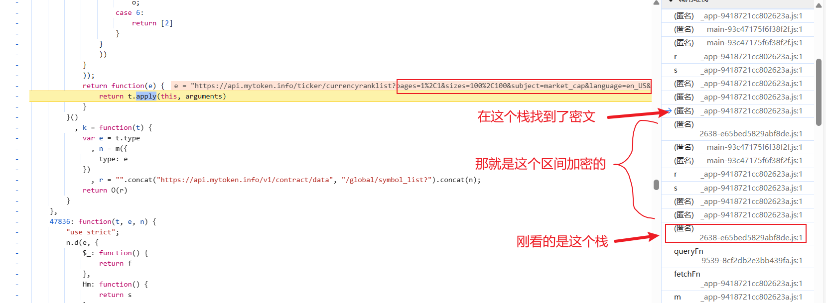这么多栈欸,这次我们直接先看最后一个栈,万一最后一个栈是加密位置,顺着分析栈前面不白分析了么