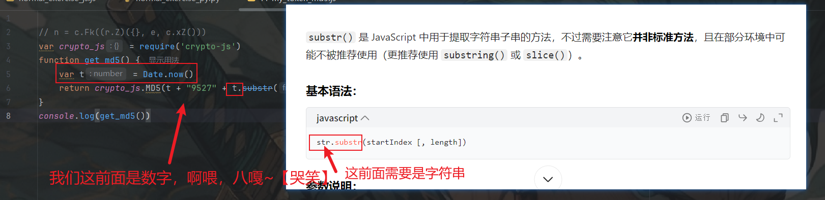 var crypto_js = require('crypto-js')function get_md5() {return crypto_js.MD5(e + "9527" + e.substr(0, 6)).toString // 一定记得加toString