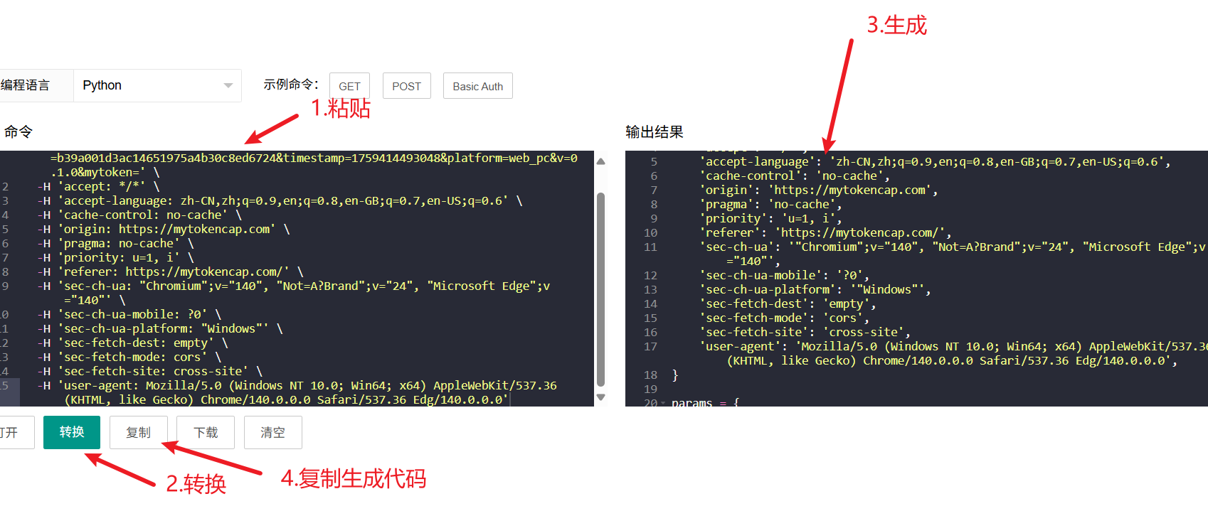 我们直接套公式然后再去[工具网站](https://www.lddgo.net/convert/curl-to-code)生成基础爬虫,然后封装一下:粘贴到编程工具中之后先运行一下看看会不会出错,然后将密文那一行注释掉看看能不被不过拿到数据(看看后端校不校验参数,这些其实应该先做的,不校验直接拿到数据就不用逆向了),这里肯定拿不到,那我们就开始调用js生成密文然后写入py吧: