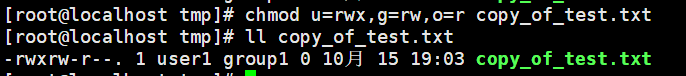 为copy_of_test.txt文件设置权限,使得所有者有读写执行权限,所属组有读和执行权限,其他用户只有读权限,写出具体命令。