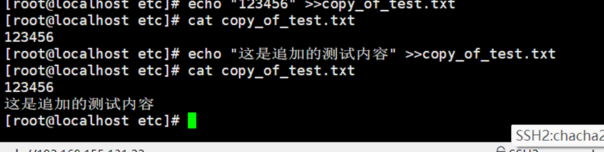 (2). 向copy_of_test.txt文件中追加一行内容 “这是追加的测试内容”,并使用命令查看文件内容确认追加成功。