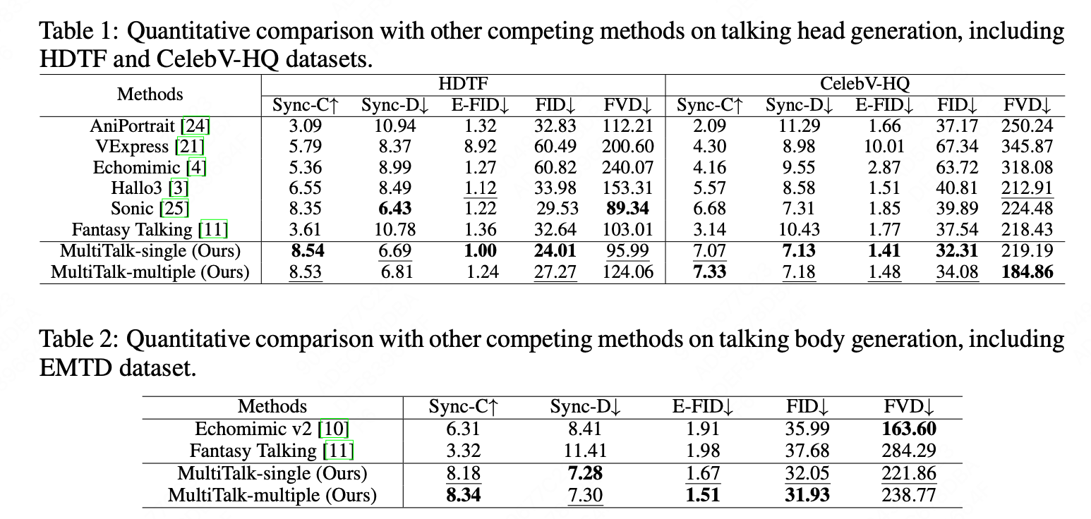 在定量评估中,MultiTalk在说话的头和说话的身体生成任务上,与AniPortrait、VExpress、EchoMimic、Hallo3、Sonic、Fantasy Talking等多个最先进的方法进行了对比。结果显示,MultiTalk在大多数指标上超越了这些方法,尤其在唇形同步(Sync-C, Sync-D)和视频质量(FID, FVD)方面表现出卓越性能。