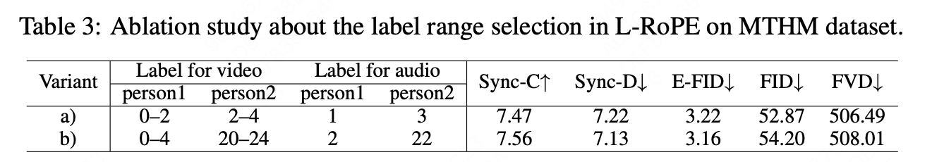 为了验证L-ROPE的有效性,论文进行了一项消融研究,重点关注标签范围的选择。实验结果(如下表3所示)表明,即使为不同人物选择不同的标签范围,所产生的性能指标接近。这说明L-ROPE对具体的标签范围变化不敏感。
