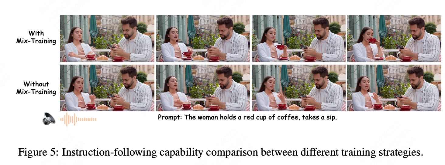 MultiTalk采用了多任务混合训练范式,将模型训练任务分为音频+图像到视频(AI2V)训练和图像到视频(I2V)训练。尽管任务不同,但它们共享相同的网络参数。在AI2V任务中,模型同时使用参考图像和音频作为条件输入,专注于学习音频驱动的唇形同步和动作生成。在I2V任务中,音频条件被移除(通过将音频嵌入置零)。I2V任务使用的训练数据是独特的,主要包含大量多事件视频。这些视频涵盖了人物、物体和场景之间复杂的交互,例如人物拿起杯子、与环境互动等。这种多事件数据集对于确保模型能够准确理解和执行文本提示中描述的复杂动作和交互至关重要。论文指出,如果仅使用说话的头和身体数据进行AI2V训练,网络的指令遵循能力会显著削弱。然而,通过将I2V训练纳入多任务范式,模型能够有效地保留其强大的指令遵循能力,从而生成更符合用户意图的视频,如下图5所示。这种策略体现了泛化与鲁棒性,即通过多任务训练,在保持特定任务能力的同时,增强模型的通用理解和指令遵循能力。