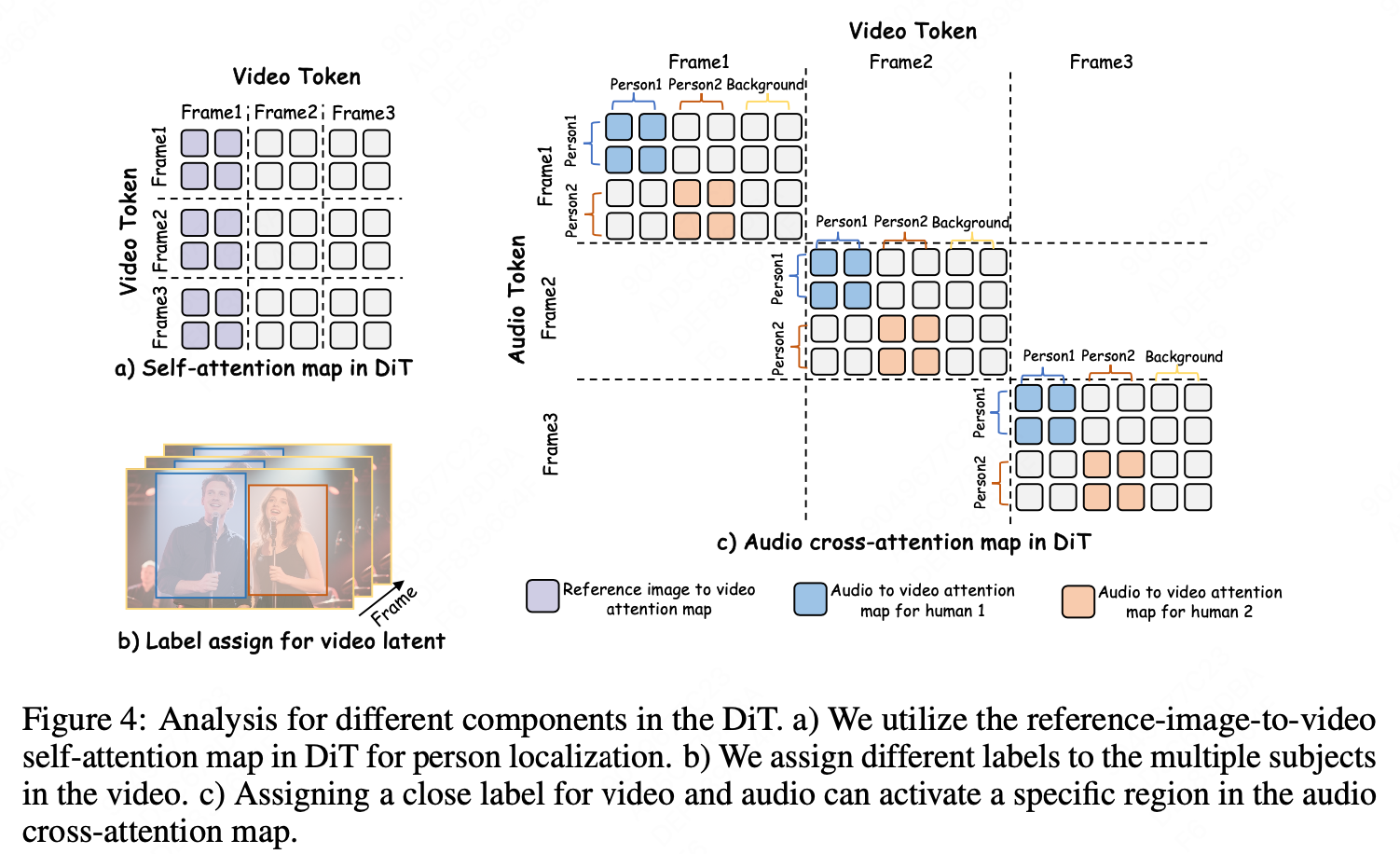 为了解决这个问题,MultiTalk提出了L-ROPE。在应用L-ROPE进行音频绑定之前,MultiTalk首先需要解决一个基础问题:如何在视频中动态地识别并追踪每个人物的位置。给定包含多个人物的参考图像,模型首先识别出每个人物的掩码区域以及背景掩码。在DiT模型中,视频的第一帧通常作为参考图像。MultiTalk利用“参考图像到视频的自注意力图”。如图4a),通过计算视频潜在空间中每个Token与参考图像中每个人物掩码的平均相似度,模型能够得到一个相似度矩阵。利用这个相似度矩阵,模型可以自适应地确定视频中每个潜在Token属于哪个人物或背景,从而实现了对每个人物的动态定位和追踪。