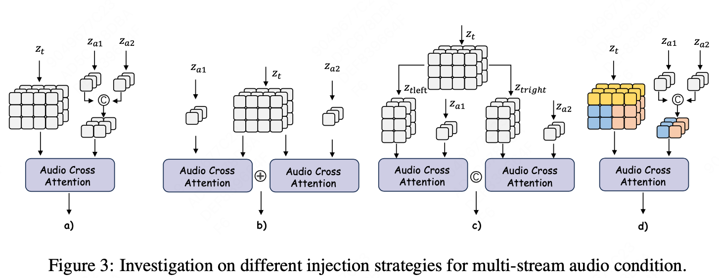 - 分别计算后相加: 分别计算每个音频流与视频潜在空间的交叉注意力结果,然后将这些结果相加。然而,这种方法同样未能解决绑定问题,模型无法区分哪个音频应该驱动哪个人物。