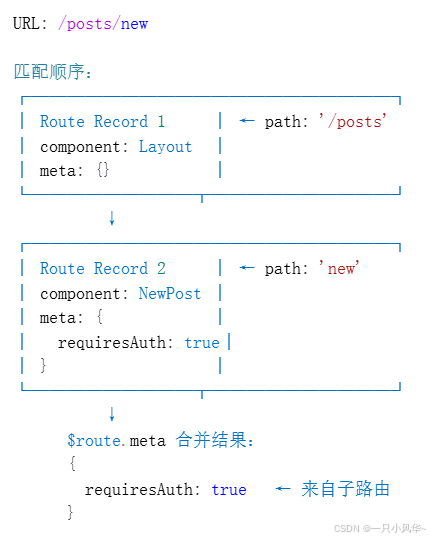 是从父到子合并的浅拷贝结果,同名属性会被子级覆盖。导航守卫结合 meta 使用:可在