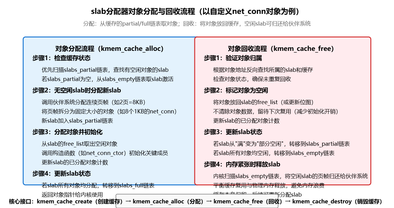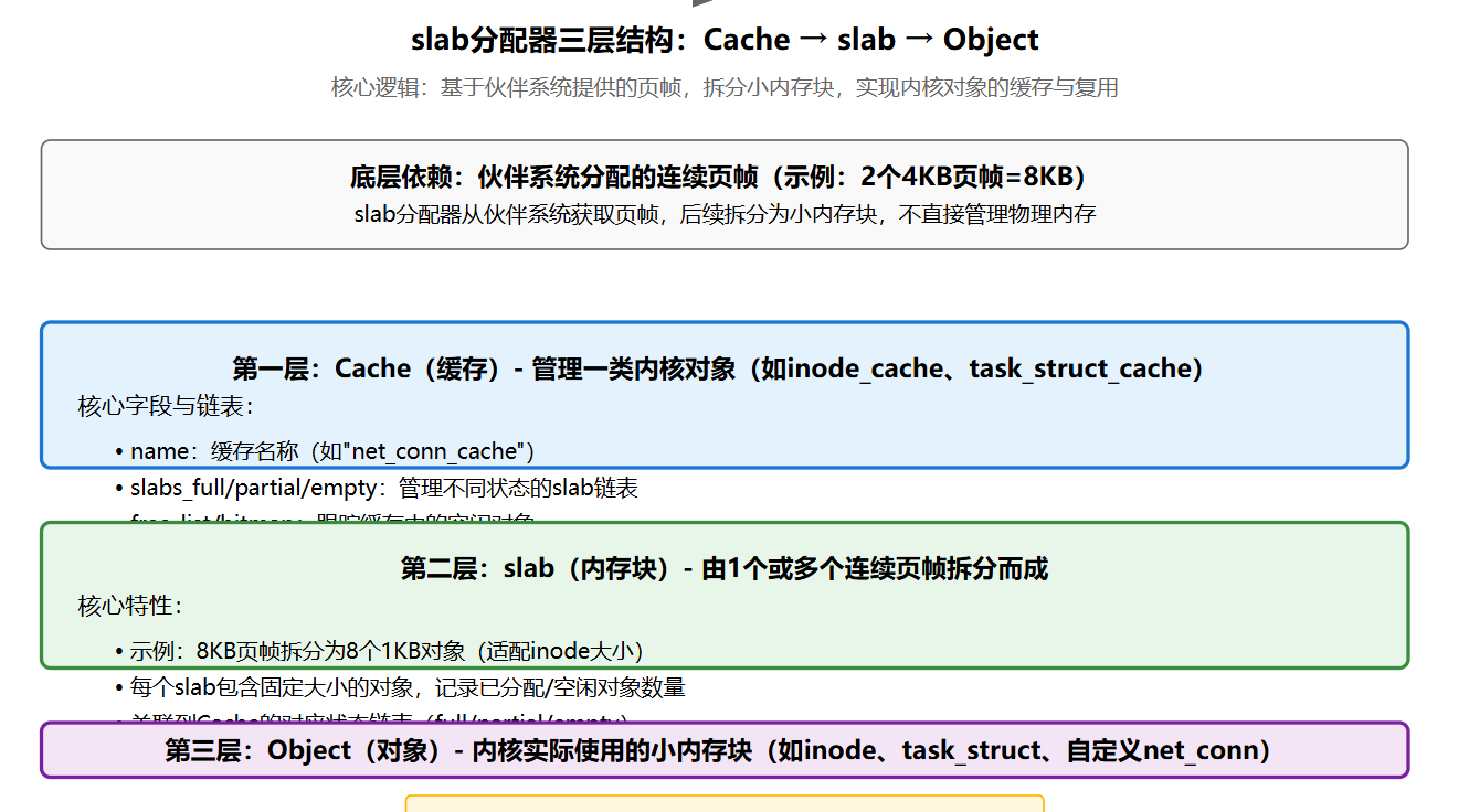 slab分配器作为Linux内核内存管理的“中间层”,填补了伙伴系统在小内存块分配上的短板,其核心价值体现在: