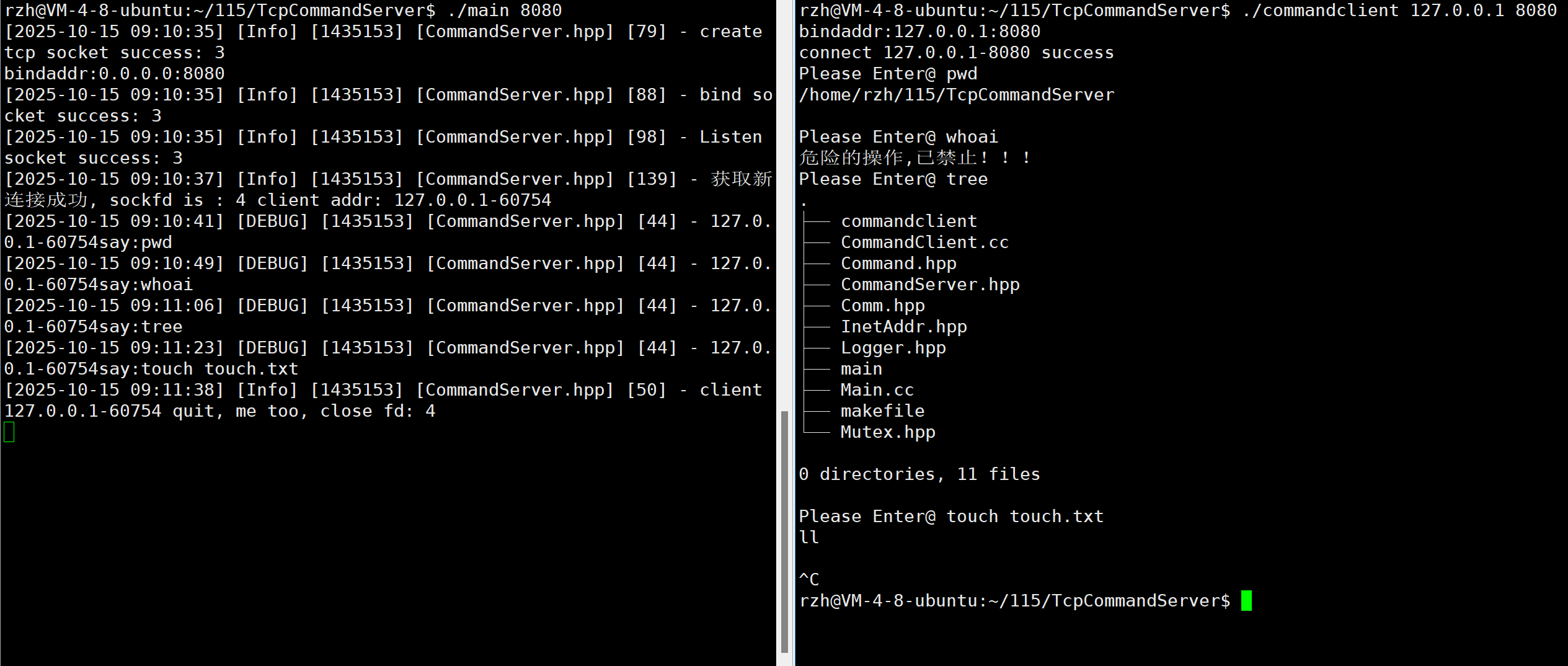 public:Command(){_command_white_list.push_back("ls -a -l");_command_white_list.push_back("ll");_command_white_list.push_back("cat test.txt");_command_white_list.push_back("touch touch.txt");_command_white_list.push_back("tree");_command_white_list.push_back("whoami");_command_white_list.push_back("who");_command_white_list.push_back("pwd");}string Exec(const string &cmd){//我们要先检测输入的指令是否安全,是不是在白名单内(以防有坏人想给我们系统捣乱)if(!IsSafe(cmd)){//指令不安全return "危险的操作,已禁止!!!";}string result;FILE* fp=popen(cmd.c_str(),"r"); //读取指令if(fp==nullptr){result=cmd+"exec error";}else{char buffer[1204];while(fgets(buffer,sizeof(buffer),fp)!=nullptr) //从fp中读取流,存到buffer里面{result+=buffer;}pclose(fp);}return result;}~Command(){}