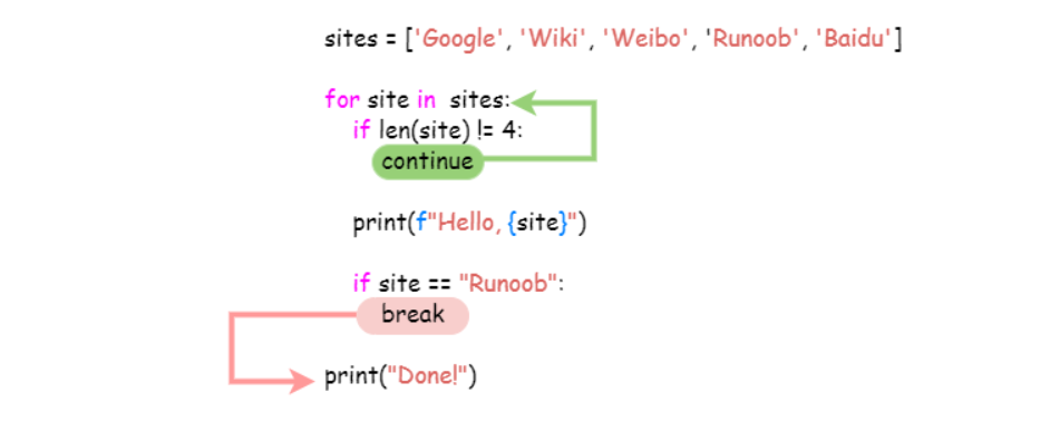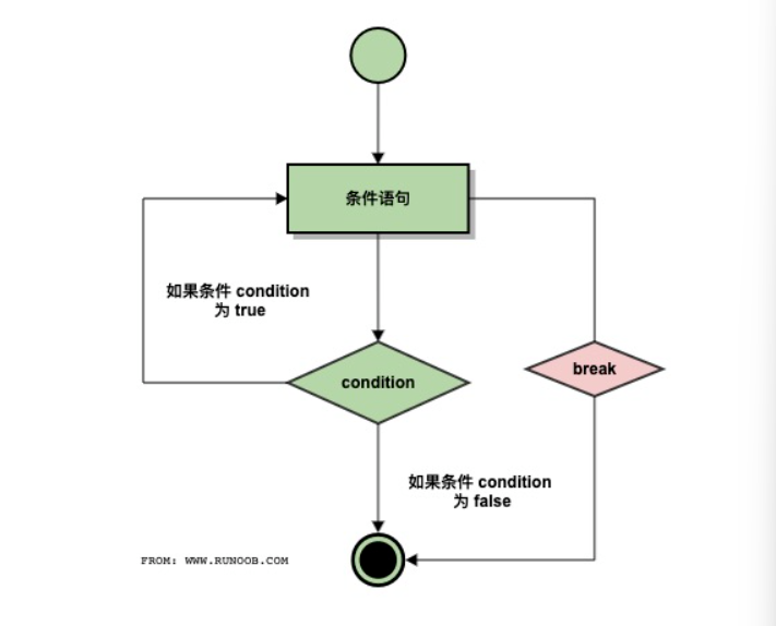 break 语句可以跳出 for 和 while 的循环体。如果你从 for 或 while 循环中终止,任何对应的循环 else 块将不执行。