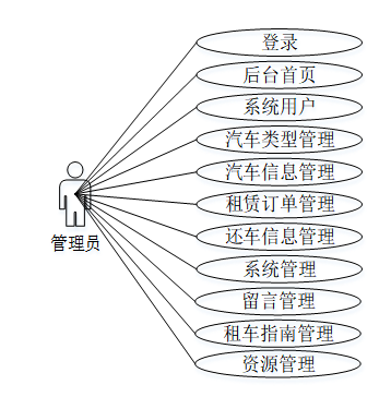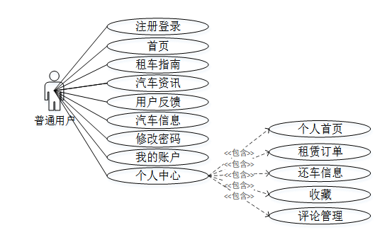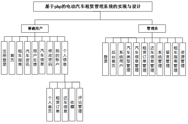 按照电动汽车租赁管理系统的角色,主要包括普通用户模块和管理员这两大功能模块,各模块功能内容如下: