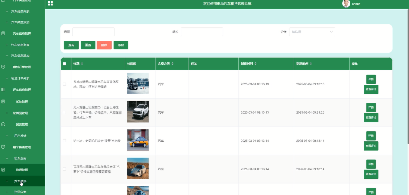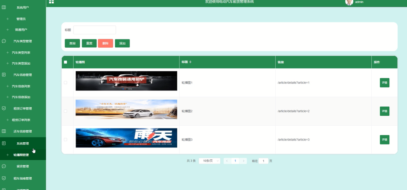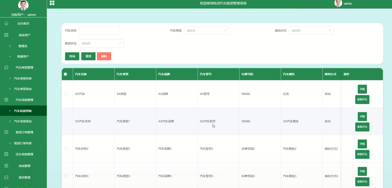 管理员管理可租赁车辆的信息,包括添加新车信息、更新车辆状态(如可用、租出、维修中)、删除下架车辆等,确保车辆信息的实时性和准确性。其界面如下图所示。