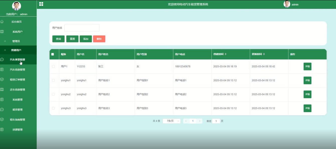 管理员可以管理普通用户和管理员账号,查看详情并执行增删改查操作。其界面如下图所示。