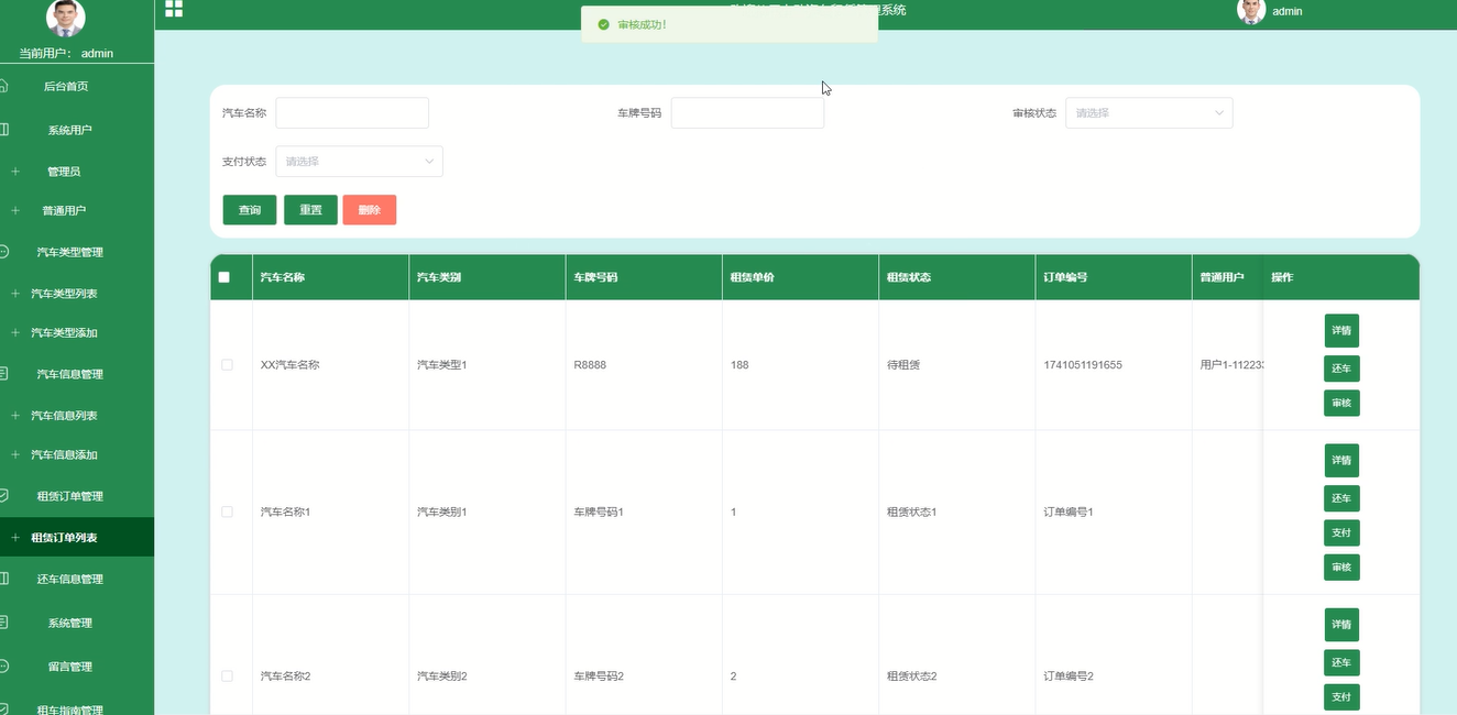 员工可以查看和管理用户的租车订单历史,包括订单详情、状态跟踪、支付记录等,方便用户随时了解订单情况。其界面如下图所示。