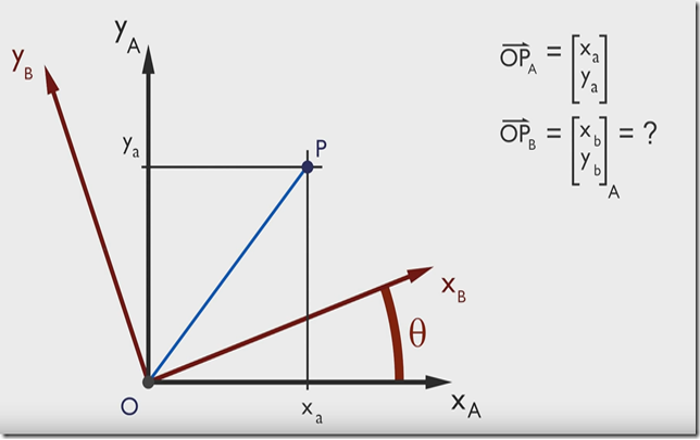 例子:有点P(Xa,Ya),当坐标由 x –> y 旋转 θ 度后,求该点在新坐标轴的坐标是多少?