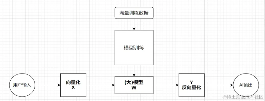 2)模型应用进化阶段:将用户输入的信息转化为向量X,模型W矩阵对用户的输入向量X进行各种计算,得到一个向量Y,再将Y反向量化为用户能看懂的信息(比如:文本)。在实际的应用过程中,模型会随着用户的使用交流,得到进化,本质上是矩阵W的某些数值会发生调整。
