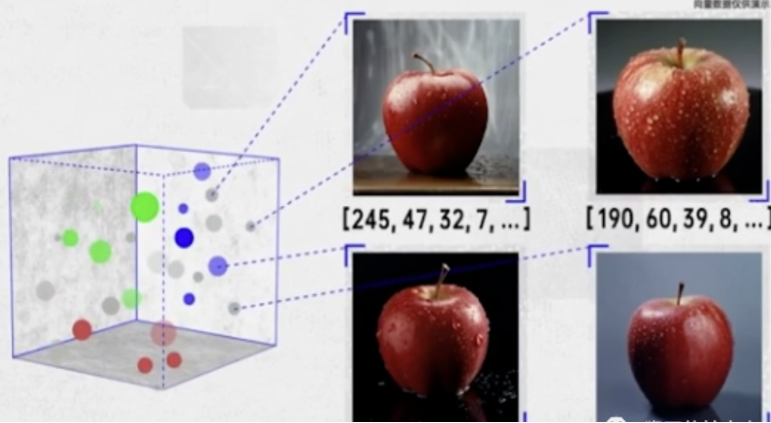 婴儿看到新的苹果,大脑也会将新苹果的特征提取为向量。大苹果、小苹果,从颜色、大小、形状、纹理等等维度是很相似的,显然,把这些苹果抽象成多个向量,这些向量在向量空间中的距离肯定是很近的。