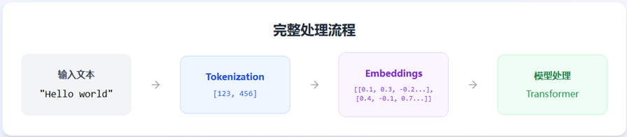 Embeddings: 模型内部处理,将Token ID转换为包含语义信息的高维向量。 输入:Token ID 输出:语义向量 特点:连续、语义化、可训练