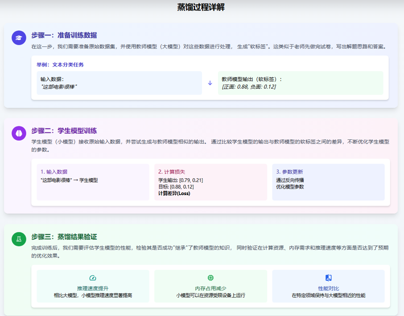 定义:模型蒸馏是一种知识传递技术,让一个庞大的、能力强的“教师模型”去教导一个小的“学生模型”,实现知识从大模型向小模型的转移。