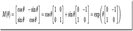 通过数学计算可以得到旋转矩阵M,任何一个二维的向量点乘这个旋转矩阵M都可以得到一个旋转后的向量。