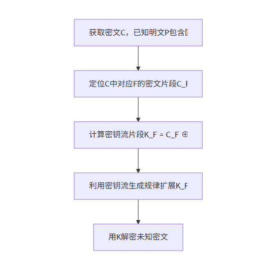当明文包含已知固定字段(如TCP报文头的"SYN"标志、PNG文件的魔法数"\x89PNG")时,攻击者可通过"密文固定字段→明文固定字段"的映射关系直接反推密钥。以流密码为例,攻击过程如下: