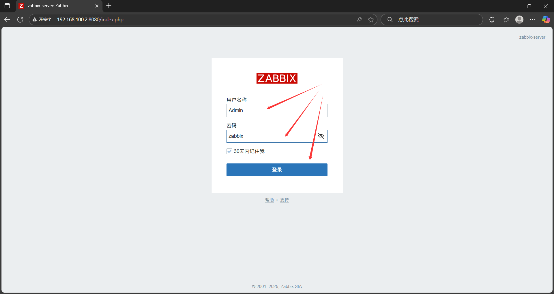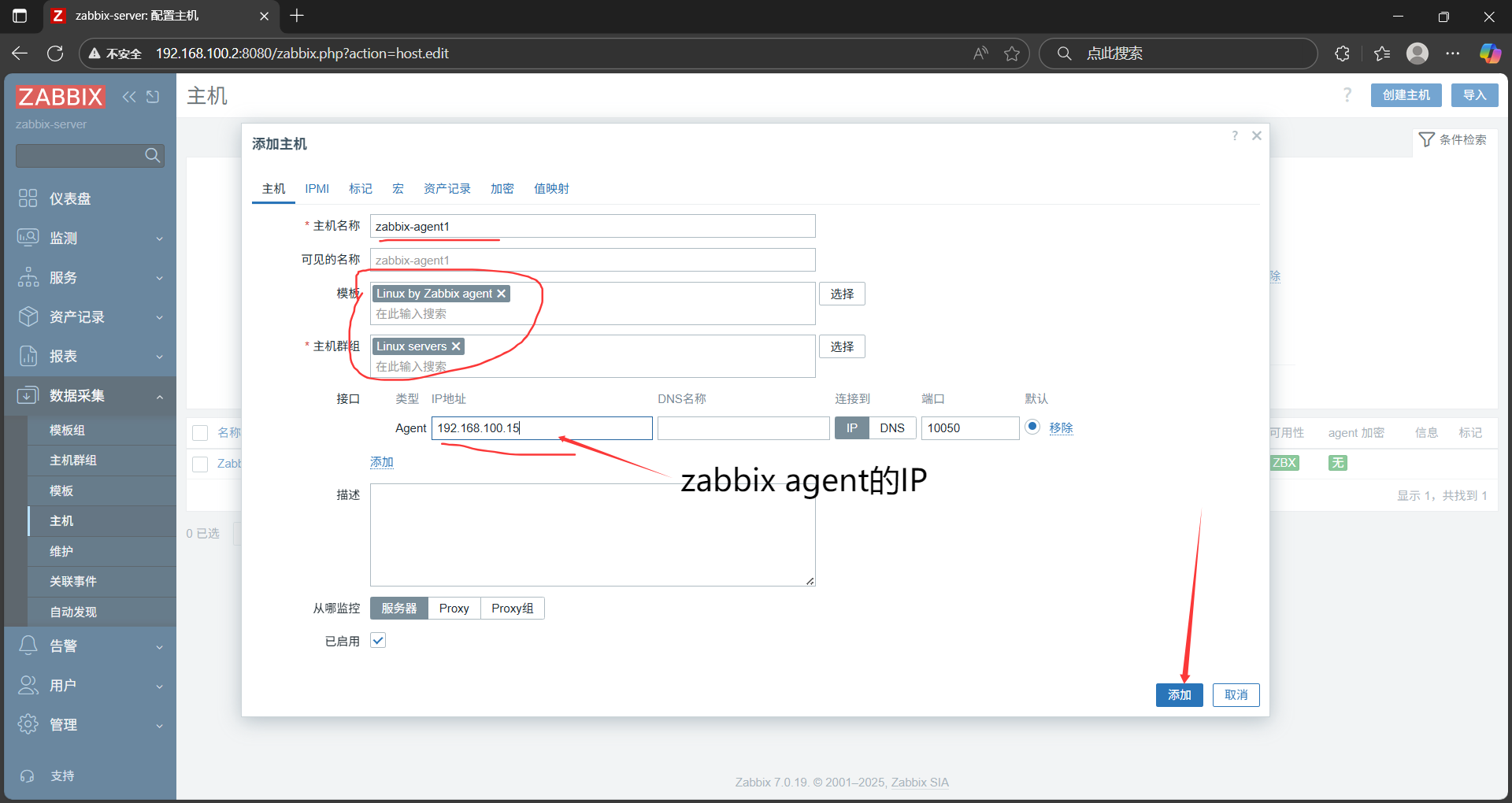 # 关闭防火墙与selinux# 配置yum源(阿里源)rm -rf /etc/yum.repos.d/*curl -o /etc/yum.repos.d/CentOS-Base.repo https://mirrors.aliyun.com/repo/Centos-7.repo# 下载zabbix agent源rpm -Uvh https://repo.zabbix.com/zabbix/7.0/rhel/7/x86_64/zabbix-release-latest-7.0.el7.noarch.rpm# 安装zabbix agentyum -y install zabbix-agent# 修改zabbix agent配置文件vim /etc/zabbix/zabbix_agentd.confServer=192.168.100.2 # zabbix server的IPServerActive=192.168.100.2 # zabbix server的IPHostname=zabbix-agent # 不能是zabbix server# 启动zabbix agent服务systemctl restart zabbix-agentsystemctl enable zabbix-agent