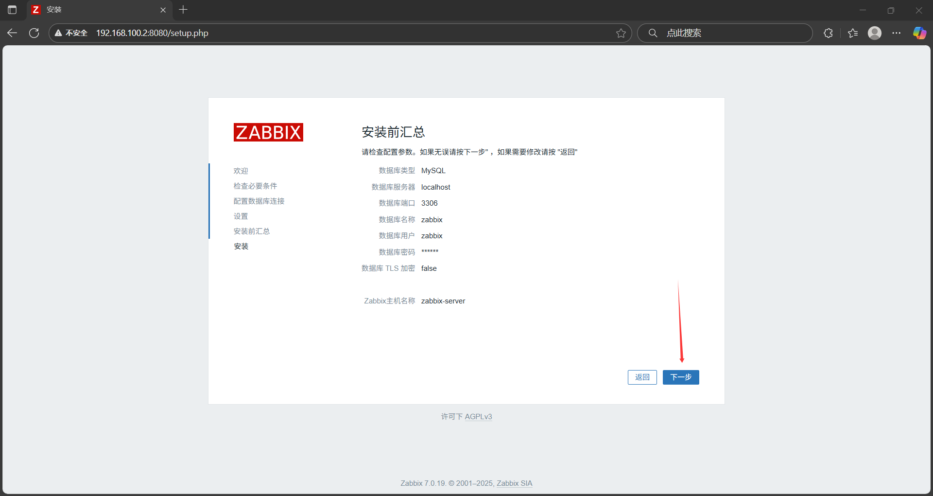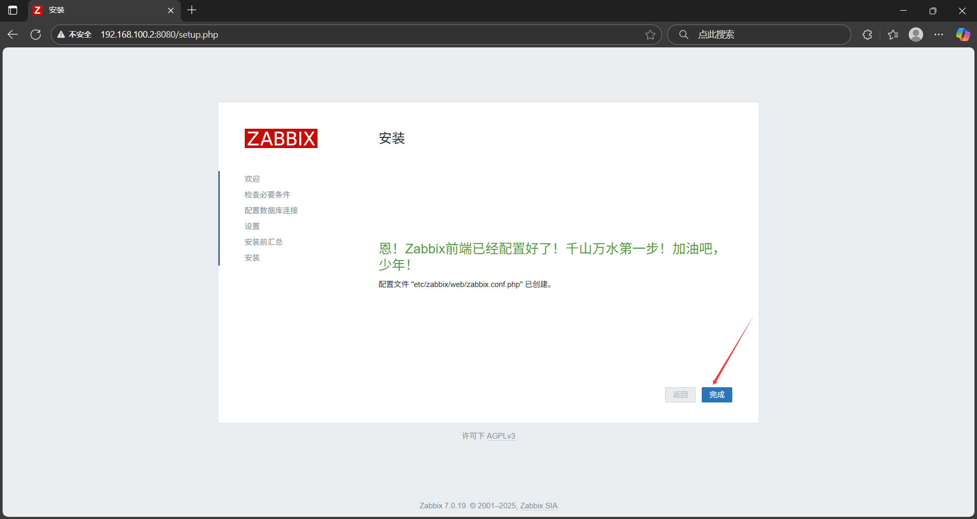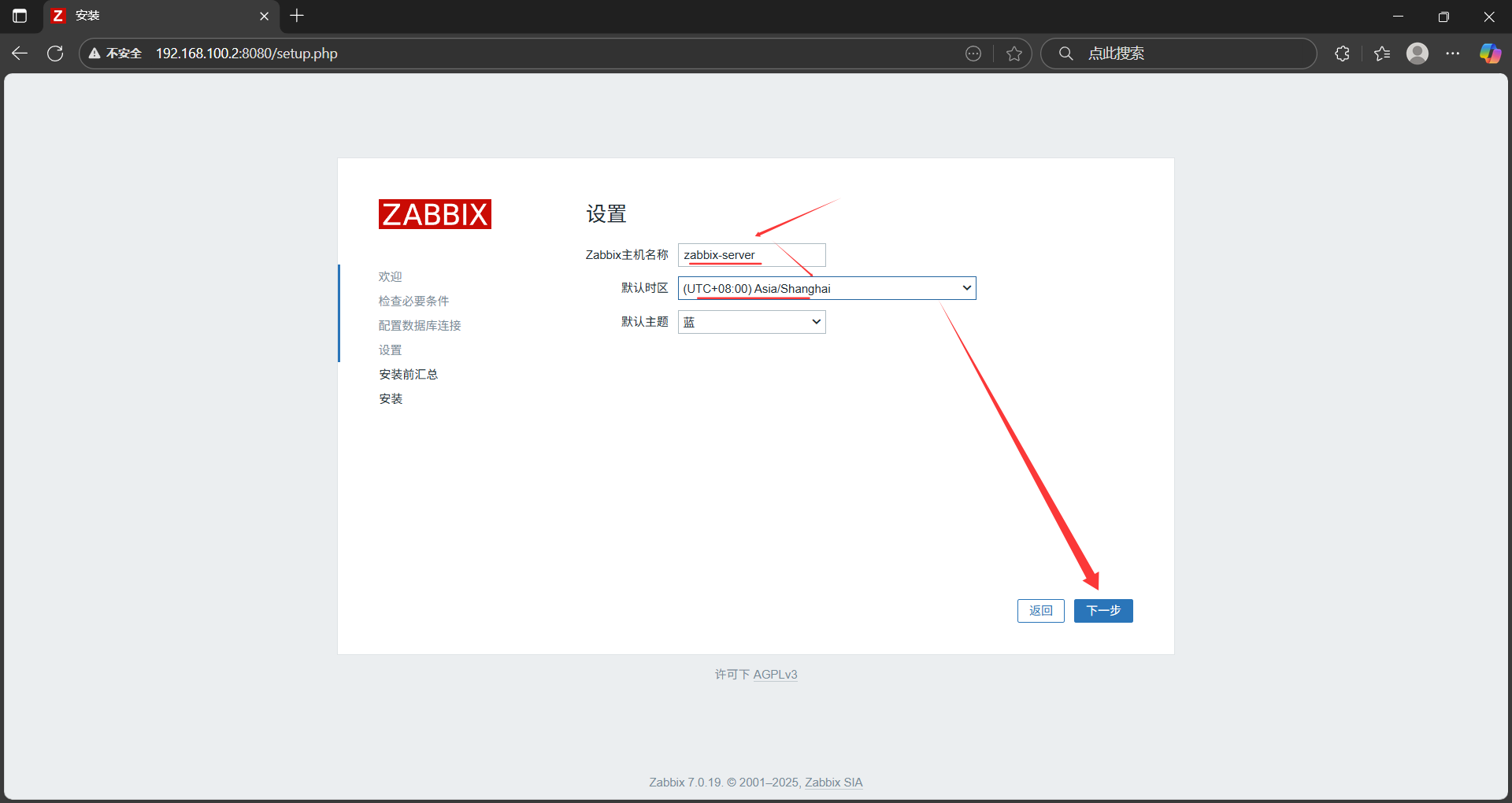 # 修改zabbix server配置文件[root@zabbix-server ~]# vim /etc/zabbix/zabbix_server.conf ListenPort=10051 DBHost=localhost DBName=zabbix DBUser=zabbix DBPassword=123456 DBSocket=/var/lib/mysql/mysql.sock ListenIP=0.0.0.0# 为zabbix前端配置php[root@zabbix-server ~]# vim /etc/nginx/conf.d/zabbix.conflisten 8080; # 去掉注释server_name example.com; # 去掉注释# 启动zabbix-server zabbix-agent nginx php-fpm服务[root@zabbix-server ~]# systemctl restart zabbix-server zabbix-agent nginx php-fpm[root@zabbix-server ~]# systemctl enable zabbix-server zabbix-agent nginx php-fpmCreated symlink /etc/systemd/system/multi-user.target.wants/zabbix-server.service → /usr/lib/systemd/system/zabbix-server.service.Created symlink /etc/systemd/system/multi-user.target.wants/zabbix-agent.service → /usr/lib/systemd/system/zabbix-agent.service.Created symlink /etc/systemd/system/multi-user.target.wants/nginx.service → /usr/lib/systemd/system/nginx.service.Created symlink /etc/systemd/system/multi-user.target.wants/php-fpm.service → /usr/lib/systemd/system/php-fpm.service.