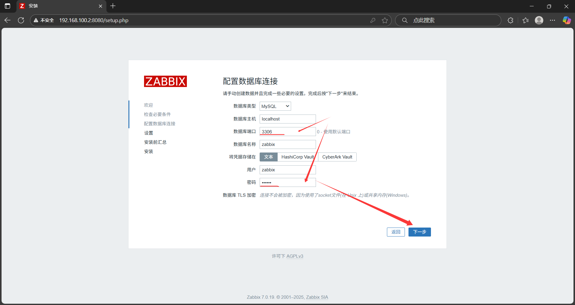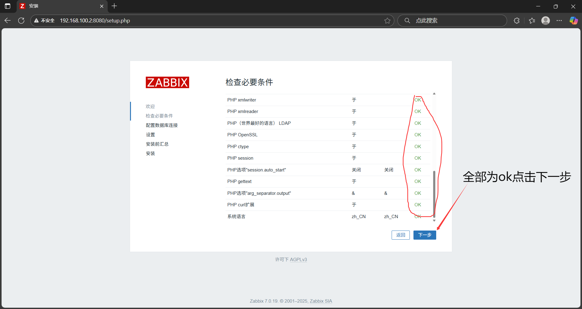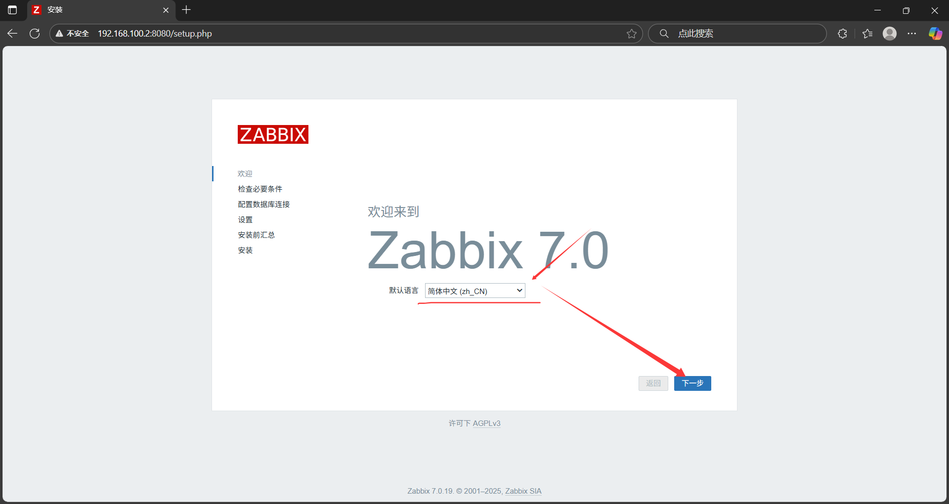 # 修改zabbix server配置文件[root@zabbix-server ~]# vim /etc/zabbix/zabbix_server.conf ListenPort=10051 DBHost=localhost DBName=zabbix DBUser=zabbix DBPassword=123456 DBSocket=/var/lib/mysql/mysql.sock ListenIP=0.0.0.0# 为zabbix前端配置php[root@zabbix-server ~]# vim /etc/nginx/conf.d/zabbix.conflisten 8080; # 去掉注释server_name example.com; # 去掉注释# 启动zabbix-server zabbix-agent nginx php-fpm服务[root@zabbix-server ~]# systemctl restart zabbix-server zabbix-agent nginx php-fpm[root@zabbix-server ~]# systemctl enable zabbix-server zabbix-agent nginx php-fpmCreated symlink /etc/systemd/system/multi-user.target.wants/zabbix-server.service → /usr/lib/systemd/system/zabbix-server.service.Created symlink /etc/systemd/system/multi-user.target.wants/zabbix-agent.service → /usr/lib/systemd/system/zabbix-agent.service.Created symlink /etc/systemd/system/multi-user.target.wants/nginx.service → /usr/lib/systemd/system/nginx.service.Created symlink /etc/systemd/system/multi-user.target.wants/php-fpm.service → /usr/lib/systemd/system/php-fpm.service.