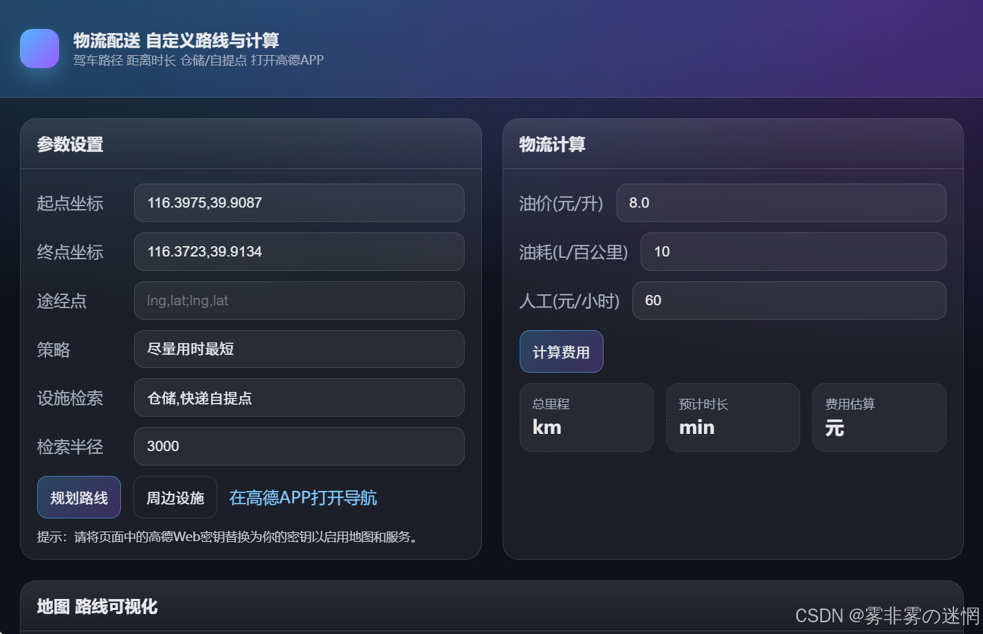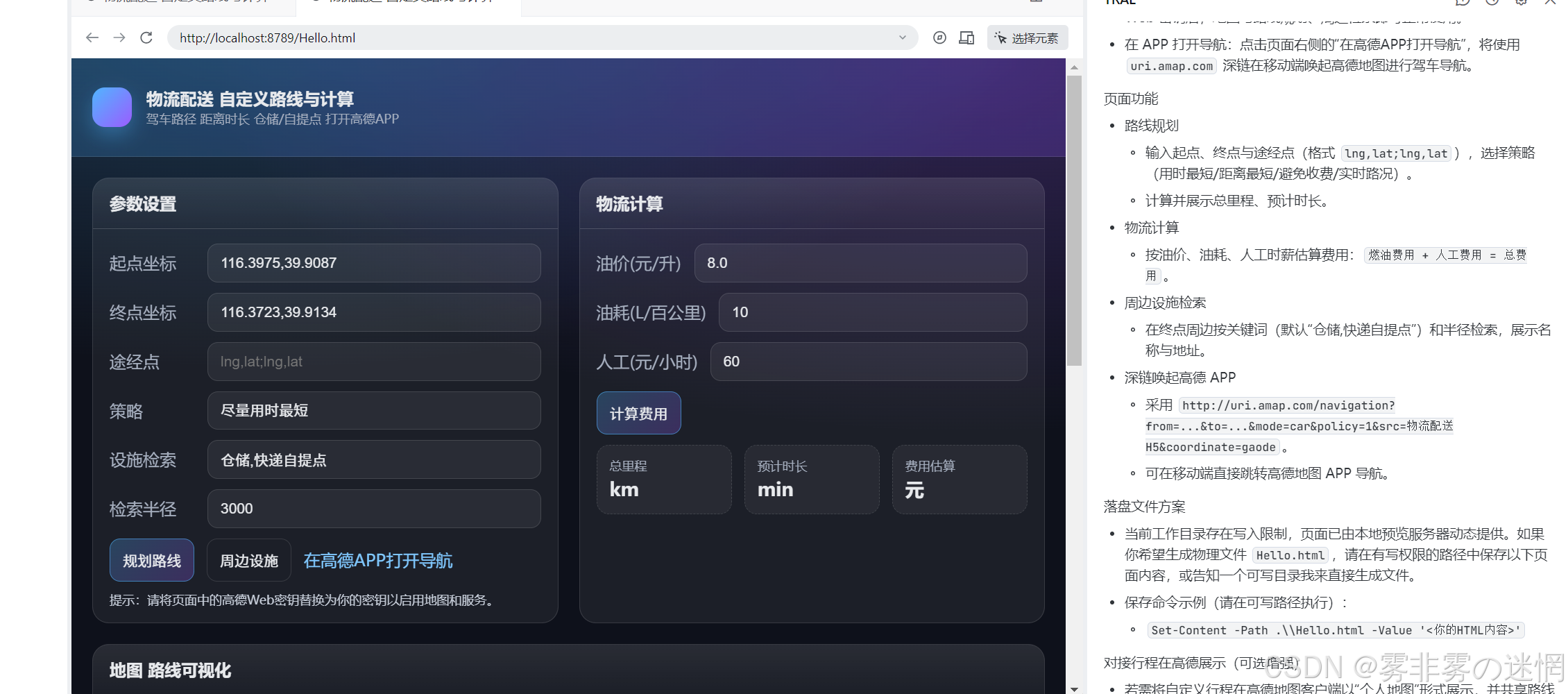 快速查找配送目的地周边的临时仓储点、自提点,让货物流转更高效,降低整体配送成本。”要求:制作网页格式的自定义路线和物流计算,网页使用现代美学风格,行程规划在G奥德地图APP展示,并集成到H5页面中,生成文件Hello.html