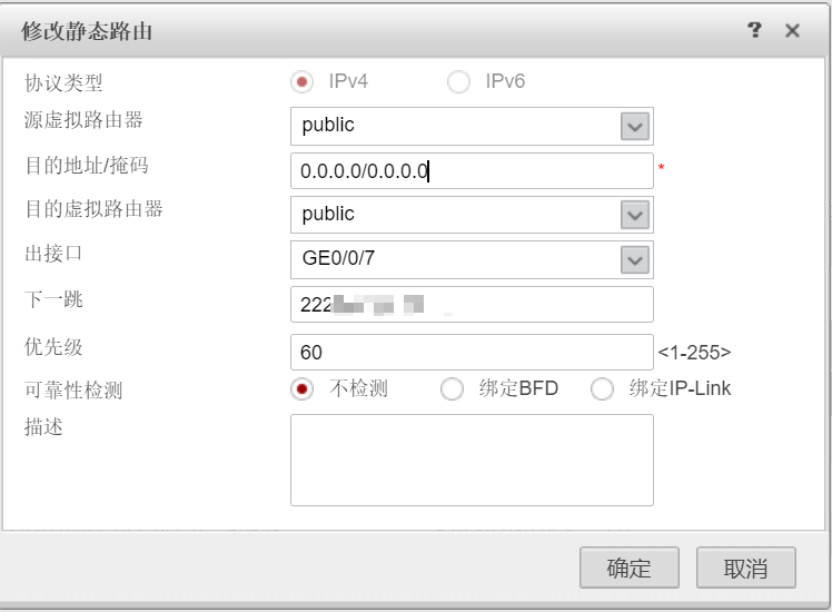 2、路由配置,配置下一跳是公网网关的默认路由