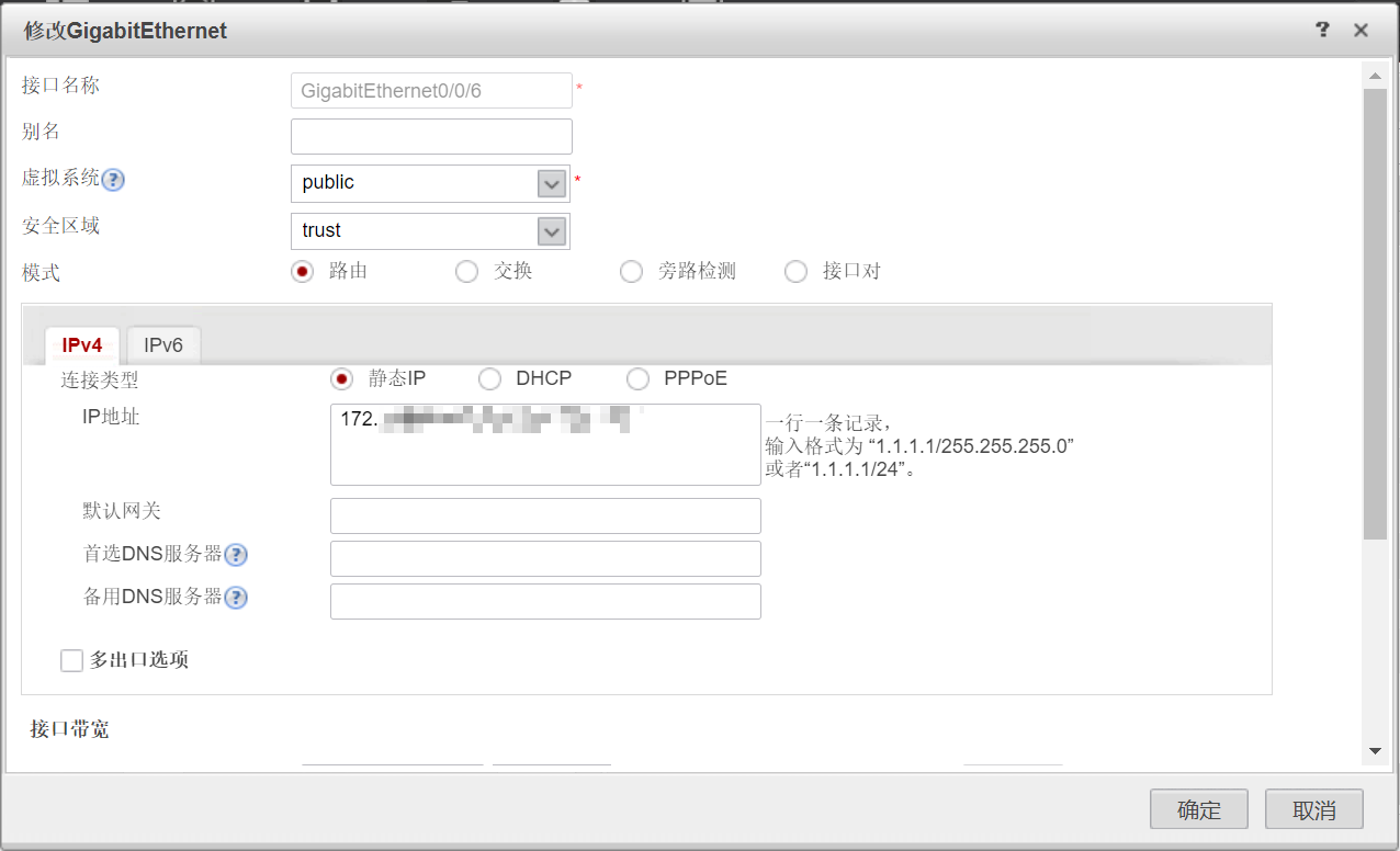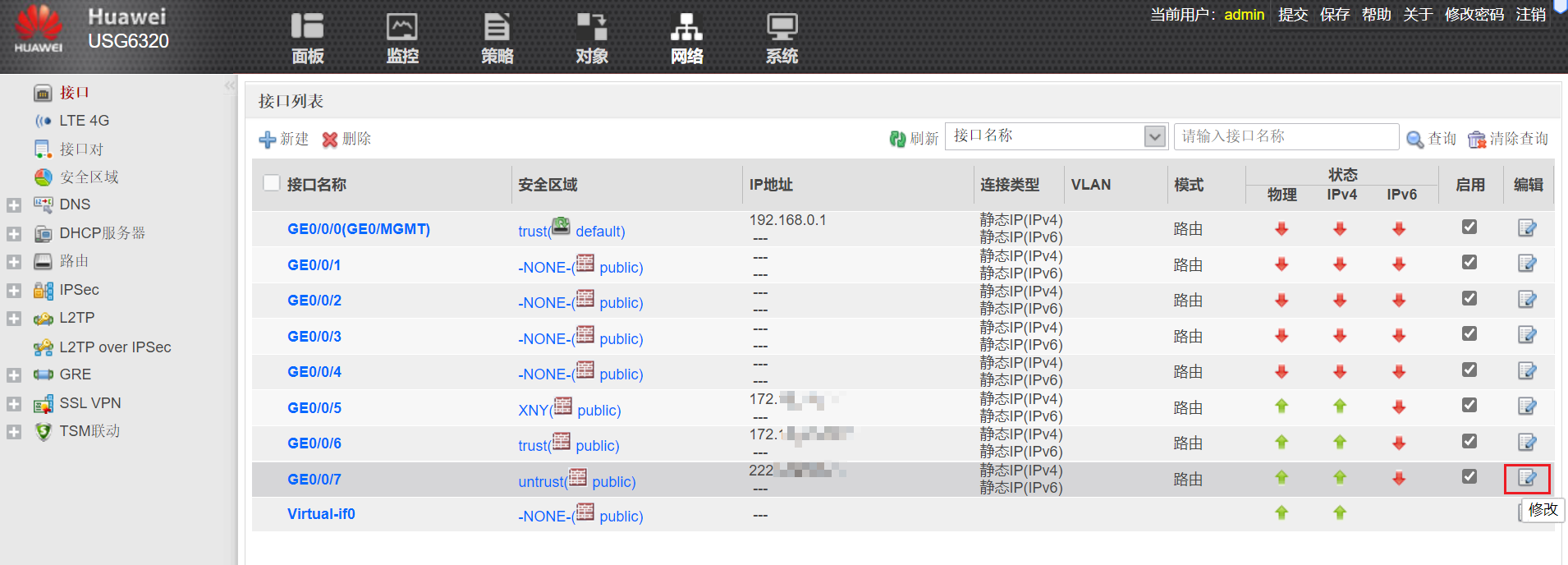 在网络-接口-连接外网的端口,点击修改