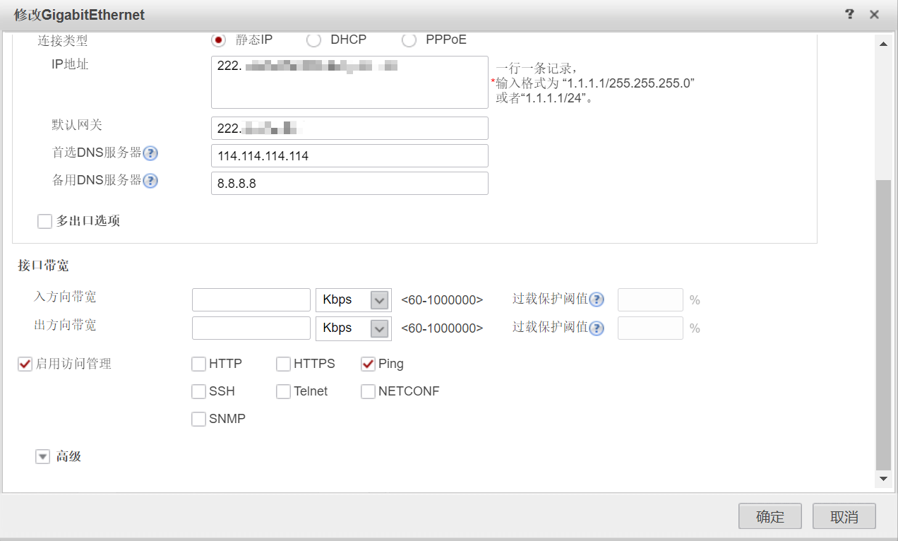 选择静态IP,IP地址、掩码、默认网关根据运营商提供的公网IP填写