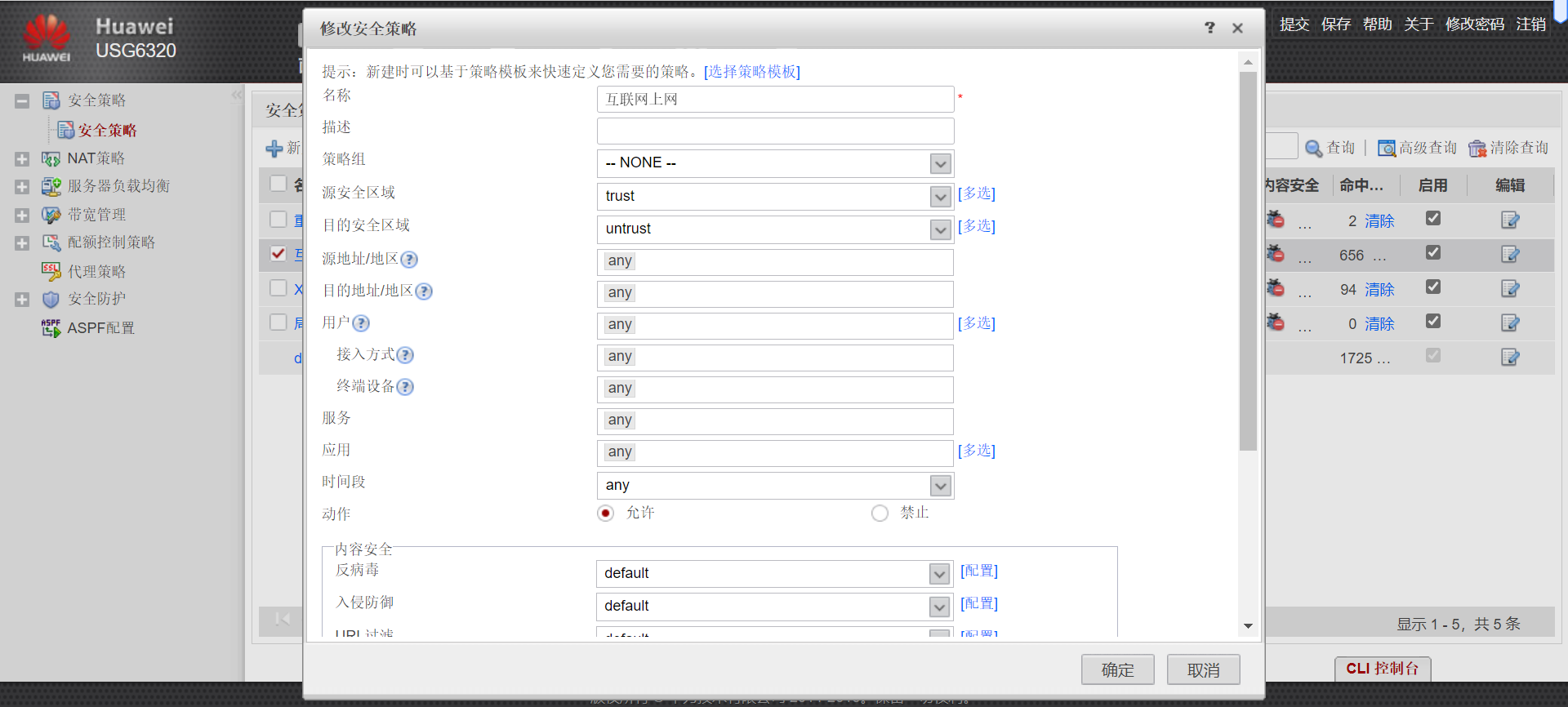 在策略-安全策略-新建,新建互联网上网安全策略,设置如下: