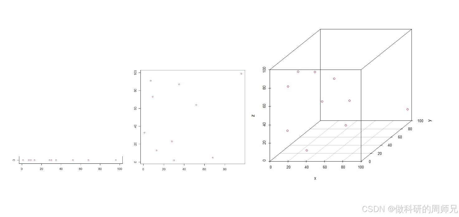 “维度灾难” 指当数据维度不断增加时,数据在空间中的分布会变得越来越稀疏,导致传统的数据分析方法(如距离计算、邻域搜索)失效,最终影响模型性能。我们可以从两个最直观的角度理解它: