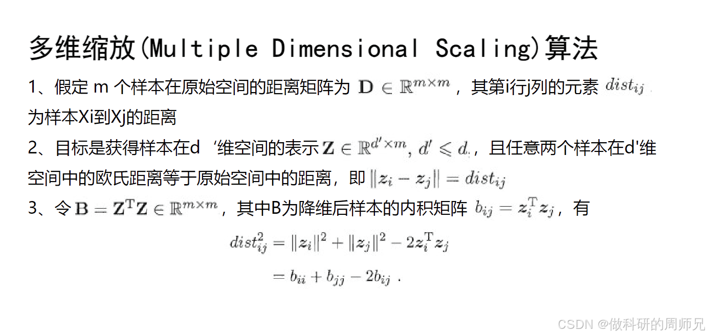 MDS 的目标是找到一个 d' 维(d' < d)的低维空间,让每个样本在低维空间中有一个坐标表示(记为zi,zi是 d' 维向量),且任意两个样本在低维空间的欧式距离,等于原始高维空间的距离,即:∥zi−zj∥=distij