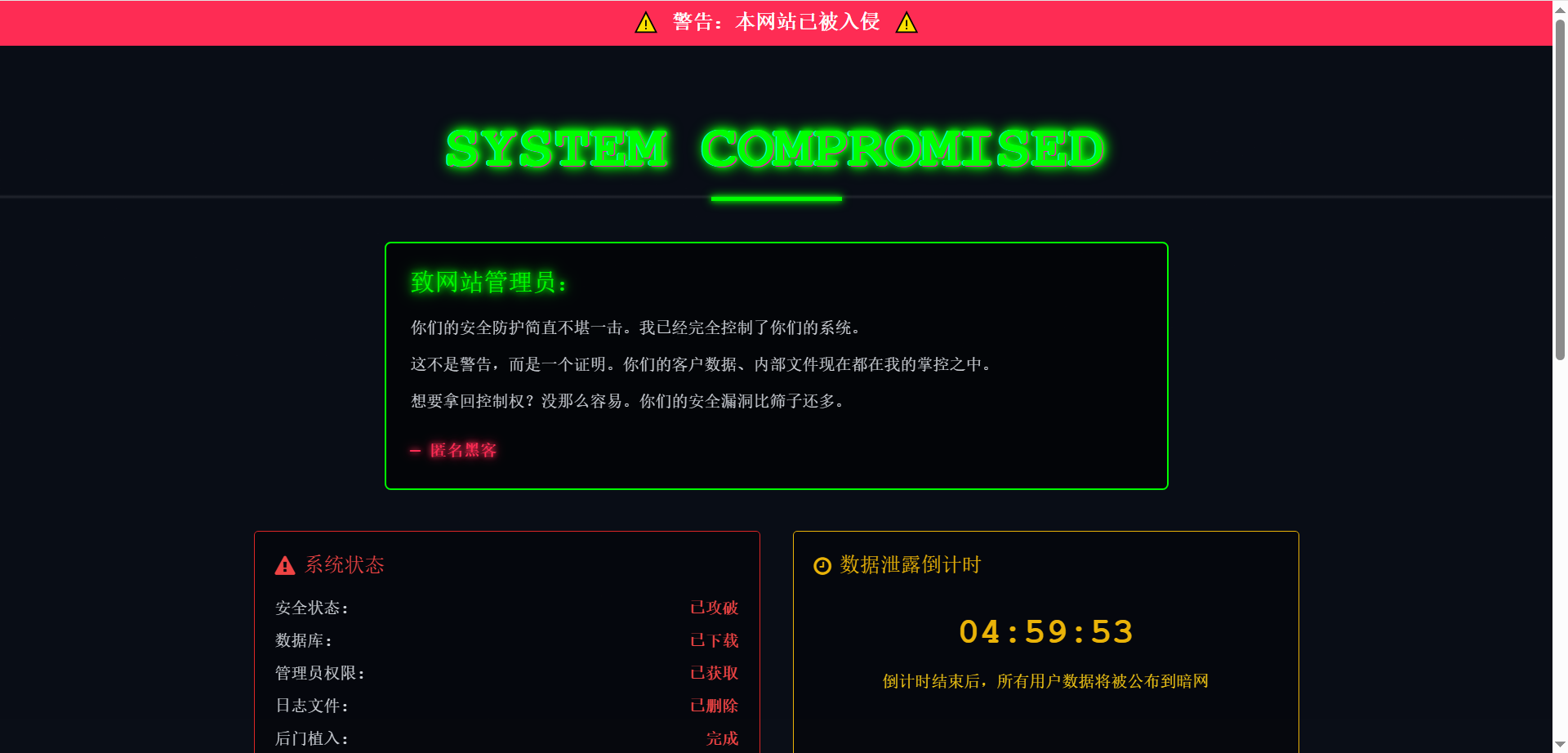 <body class="bg-hack-darkblue text-gray-300 min-h-screen font-mono relative overflow-x-hidden"><!-- 扫描线效果 --><div class="scanline"></div><!-- 顶部警告栏 --><div class="bg-hack-red text-white py-2 px-4 text-center flicker"><p class="text-lg md:text-xl font-bold">⚠️ 警告:本网站已被入侵 ⚠️</p></div><!-- 主内容区 --><div class="container mx-auto px-4 py-8 relative z-10"><!-- 黑客标志/标题 --><div class="text-center my-10"><h1 class="text-4xl md:text-6xl font-bold text-hack-glow text-shadow-glow mb-4 glitch" data-text="SYSTEM COMPROMISED">SYSTEM COMPROMISED</h1><div class="w-32 h-1 bg-hack-glow mx-auto border-glow"></div></div><!-- 黑客留言区 --><div class="max-w-3xl mx-auto bg-black/60 p-6 border-2 border-hack-glow rounded-md mb-10"><h2 class="text-2xl text-hack-glow text-shadow-glow mb-4">致网站管理员:</h2><p class="mb-3">你们的安全防护简直不堪一击。我已经完全控制了你们的系统。</p><p class="mb-3">这不是警告,而是一个证明。你们的客户数据、内部文件现在都在我的掌控之中。</p><p class="mb-3">想要拿回控制权?没那么容易。你们的安全漏洞比筛子还多。</p><p class="text-hack-red text-shadow-red mt-6 font-bold">— 匿名黑客</p></div><!-- 篡改内容展示 --><div class="grid grid-cols-1 md:grid-cols-2 gap-8 max-w-5xl mx-auto"><!-- 左侧:系统信息被篡改 --><div class="bg-black/40 p-5 rounded border border-red-600"><h3 class="text-xl text-red-500 mb-4 flex items-center"><i class="fa fa-exclamation-triangle mr-2"></i>系统状态</h3><ul class="space-y-2"><li class="flex justify-between"><span>安全状态:</span> <span class="text-red-500 font-bold">已攻破</span></li><li class="flex justify-between"><span>数据库:</span> <span class="text-red-500 font-bold">已下载</span></li><li class="flex justify-between"><span>管理员权限:</span> <span class="text-red-500 font-bold">已获取</span></li><li class="flex justify-between"><span>日志文件:</span> <span class="text-red-500 font-bold">已删除</span></li><li class="flex justify-between"><span>后门植入:</span> <span class="text-red-500 font-bold">完成</span></li></ul></div><!-- 右侧:倒计时/威胁 --><div class="bg-black/40 p-5 rounded border border-yellow-500"><h3 class="text-xl text-yellow-500 mb-4 flex items-center"><i class="fa fa-clock-o mr-2"></i>数据泄露倒计时</h3><div class="text-center py-4"><div id="countdown" class="text-4xl font-bold text-yellow-500">05:00:00</div><p class="mt-4 text-yellow-400">倒计时结束后,所有用户数据将被公布到暗网</p></div></div></div><!-- 被篡改的页面内容 --><div class="max-w-5xl mx-auto mt-10 bg-black/30 p-6 rounded border border-gray-700"><h3 class="text-xl text-white mb-4">原网站内容已被替换</h3><div class="grid grid-cols-1 md:grid-cols-3 gap-4"><div class="bg-gray-900/70 p-3 rounded border border-gray-700"><p class="text-red-400">文件系统已被加密</p><i class="fa fa-lock text-4xl text-center my-3 text-red-500"></i></div><div class="bg-gray-900/70 p-3 rounded border border-gray-700"><p class="text-yellow-400">管理员账户已被劫持</p><i class="fa fa-user-secret text-4xl text-center my-3 text-yellow-500"></i></div><div class="bg-gray-900/70 p-3 rounded border border-gray-700"><p class="text-green-400">系统后门已安装</p><i class="fa fa-key text-4xl text-center my-3 text-green-500"></i></div></div></div><!-- 应急响应提示 --><div class="max-w-3xl mx-auto mt-12 bg-red-900/30 p-6 rounded border border-red-800"><h3 class="text-xl text-red-400 mb-3 flex items-center"><i class="fa fa-ambulance mr-2"></i>应急响应指南</h3><ol class="list-decimal list-inside space-y-2 text-gray-200"><li>立即断开服务器网络连接</li><li>启动应急响应小组</li><li>保存当前状态快照作为证据</li><li>隔离受影响系统</li><li>根据备份恢复系统</li><li>进行安全漏洞扫描和修复</li><li>在确认安全后重新部署</li></ol></div></div><!-- 底部信息 --><footer class="mt-16 py-6 bg-black/70 border-t border-hack-glow"><div class="container mx-auto px-4 text-center text-gray-500 text-sm"><p>此页面仅用于安全应急演练,模拟网站被篡改场景</p><p class="mt-2">© 2025 安全应急演练系统</p></div></footer><!-- 背景噪点效果 --><div class="fixed inset-0 pointer-events-none z-0 opacity-10" id="noise"></div><script>// 生成背景噪点function createNoise() {const noise = document.getElementById('noise');const canvas = document.createElement('canvas');const ctx = canvas.getContext('2d');const width = window.innerWidth;const height = window.innerHeight;canvas.width = width;canvas.height = height;const imageData = ctx.createImageData(width, height);const data = imageData.data;for (let i = 0; i < data.length; i += 4) {const value = Math.random() * 255;data[i] = value;data[i + 1] = value;data[i + 2] = value;data[i + 3] = 10;}ctx.putImageData(imageData, 0, 0);noise.appendChild(canvas);}// 倒计时功能function startCountdown() {const countdownEl = document.getElementById('countdown');let hours = 5;let minutes = 0;let seconds = 0;const updateCountdown = () => {if (seconds === 0) {if (minutes === 0) {if (hours === 0) {countdownEl.textContent = "数据已泄露!";return;}hours--;minutes = 59;} else {minutes--;}seconds = 59;} else {seconds--;}const hh = hours.toString().padStart(2, '0');const mm = minutes.toString().padStart(2, '0');const ss = seconds.toString().padStart(2, '0');countdownEl.textContent = `${hh}:${mm}:${ss}`;};updateCountdown();setInterval(updateCountdown, 1000);}// 随机文字闪烁效果function randomFlicker() {const elements = document.querySelectorAll('p, li, h3');setInterval(() => {const randomIndex = Math.floor(Math.random() * elements.length);const element = elements[randomIndex];element.classList.add('flicker');setTimeout(() => {element.classList.remove('flicker');}, 300);}, 2000);}// 页面加载完成后初始化window.ad