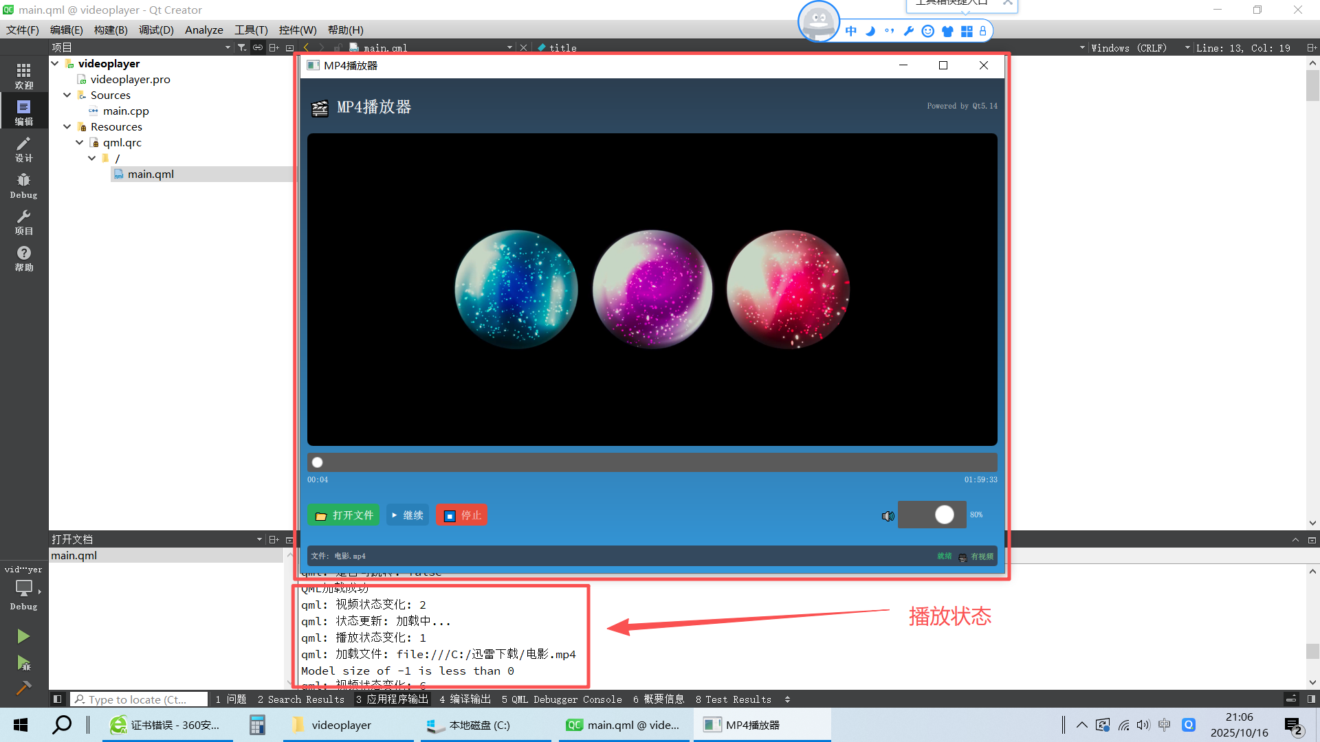 {// 设置环境变量 - 在创建QGuiApplication之前qputenv("QT_MEDIA_BACKEND", "windows");qputenv("QT_LOGGING_RULES", "qt.multimedia.*=true");qputenv("MF_DEBUG", "1");QCoreApplication::setAttribute(Qt::AA_EnableHighDpiScaling);QCoreApplication::setAttribute(Qt::AA_UseSoftwareOpenGL);QGuiApplication app(argc, argv);// 设置应用程序信息app.setApplicationName("MP4播放器");app.setApplicationVersion("1.0");app.setOrganizationName("MyCompany");// 详细的多媒体支持信息qDebug() << "=== 多媒体系统诊断信息 ===";qDebug() << "应用程序目录:" << QDir::currentPath();qDebug() << "临时目录:" << QStandardPaths::writableLocation(QStandardPaths::TempLocation);qDebug() << "支持的MIME类型数量:" << QMediaPlayer::supportedMimeTypes().count();// 输出前10个支持的格式auto mimeTypes = QMediaPlayer::supportedMimeTypes();for (int i = 0; i < qMin(10, mimeTypes.count()); ++i) {qDebug() << "支持格式:" << mimeTypes[i];}qDebug() << "环境变量:";qDebug() << "QT_MEDIA_BACKEND =" << qgetenv("QT_MEDIA_BACKEND");qDebug() << "PATH =" << qgetenv("PATH");QQmlApplicationEngine engine;// 连接加载失败信号QObject::connect(&engine, &QQmlApplicationEngine::objectCreated,&app, [](QObject *obj, const QUrl &objUrl) {if (!obj) {qCritical() << "QML加载失败:" << objUrl;QCoreApplication::exit(-1);} else {qDebug() << "QML加载成功";}}, Qt::QueuedConnection);engine.load(QUrl(QStringLiteral("qrc:/main.qml")));return app.exec();