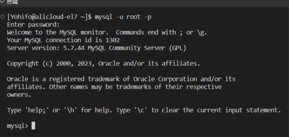 若直接在云服务器中登录,可不指定“-h”和“-P”,且当前只有一个root用户时,只需执行以下命令即可连接数据库: