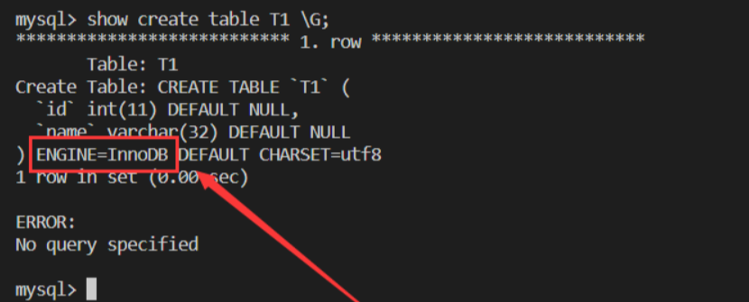 mysql> show create table T1; |
