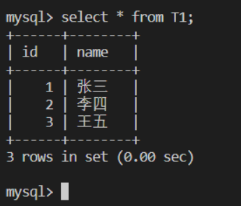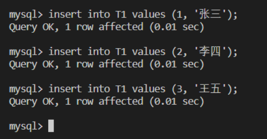 mysql> insert into T1 values (3, '王五'); |