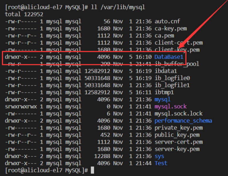 ll /var/lib/mysql/DataBase1 |