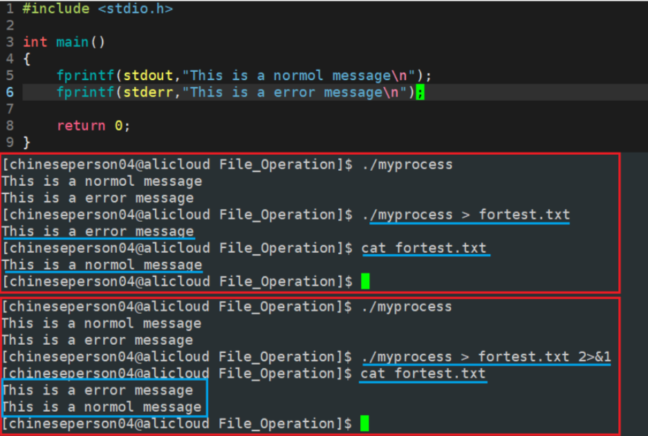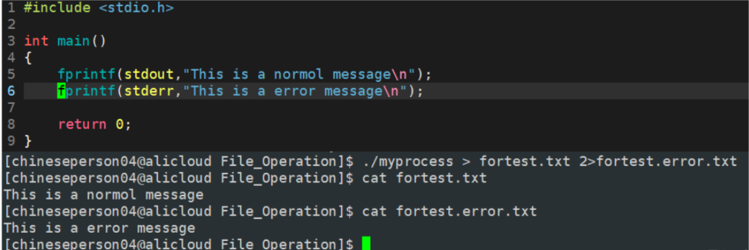 - 观察下面的代码,我们分别向标准输出和标准错误中输出一条信息,运行程序我们发现打印了两条信息,当我们使用输出重定向将运行结果写入到文件中时,我们发现输出到标准错误中的信息输出到了显示屏上,输出到标准错误中的信息写入到了文件中,因为标准重定向是向fd为1的文件中写入。