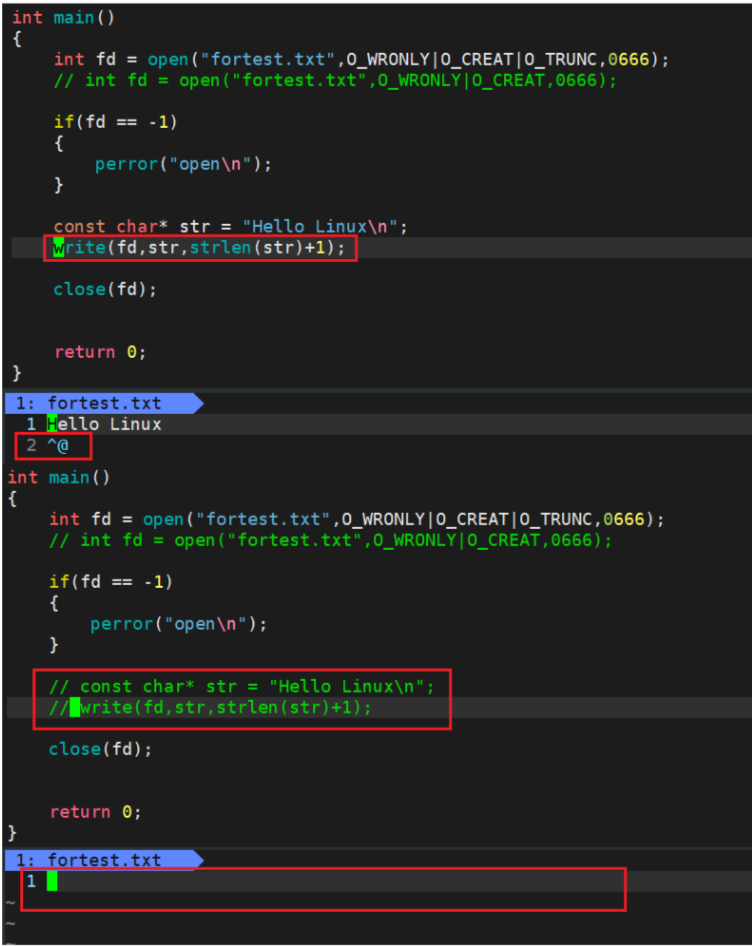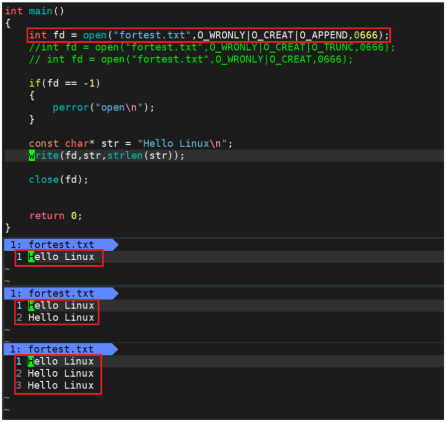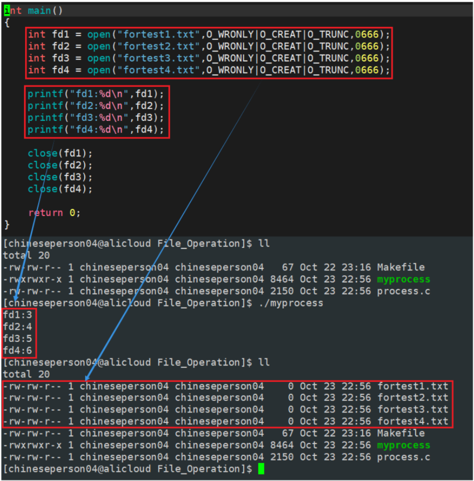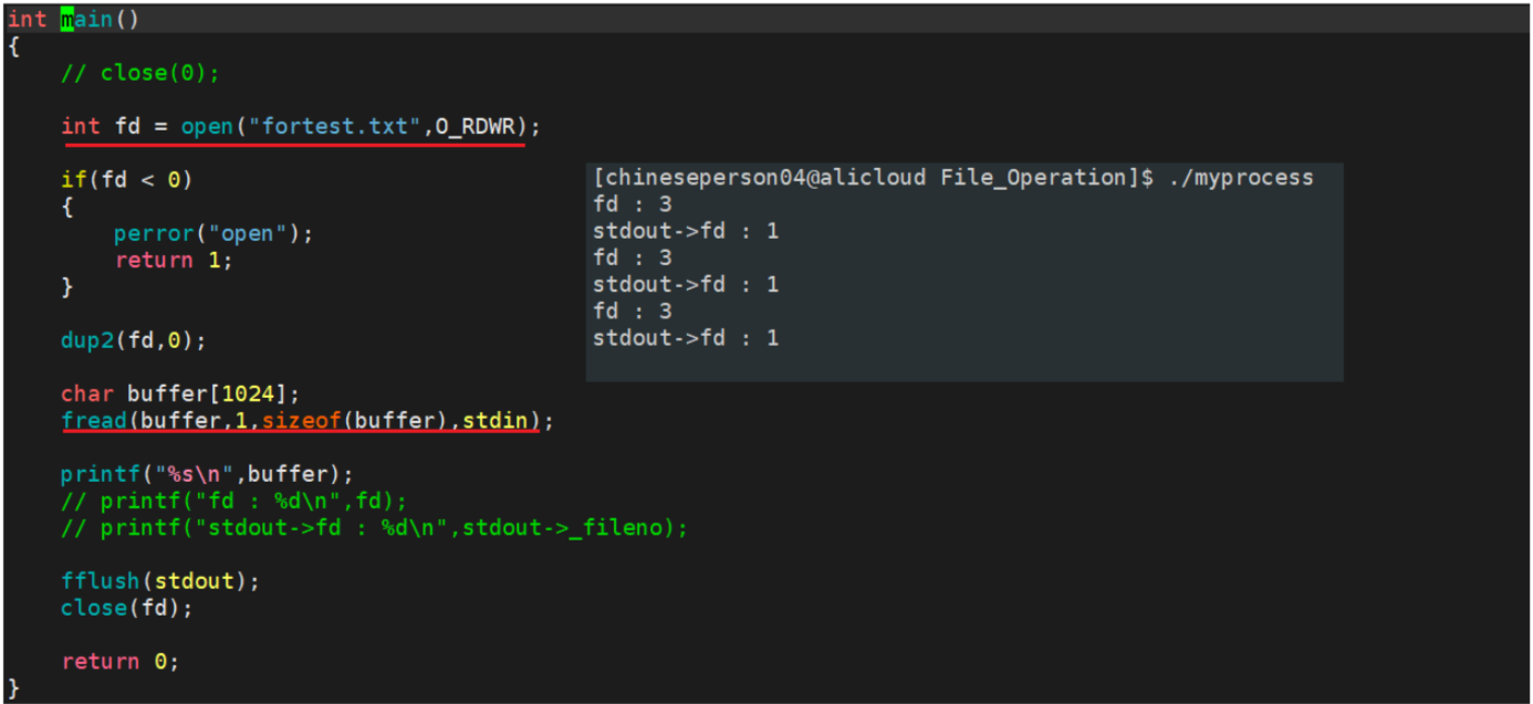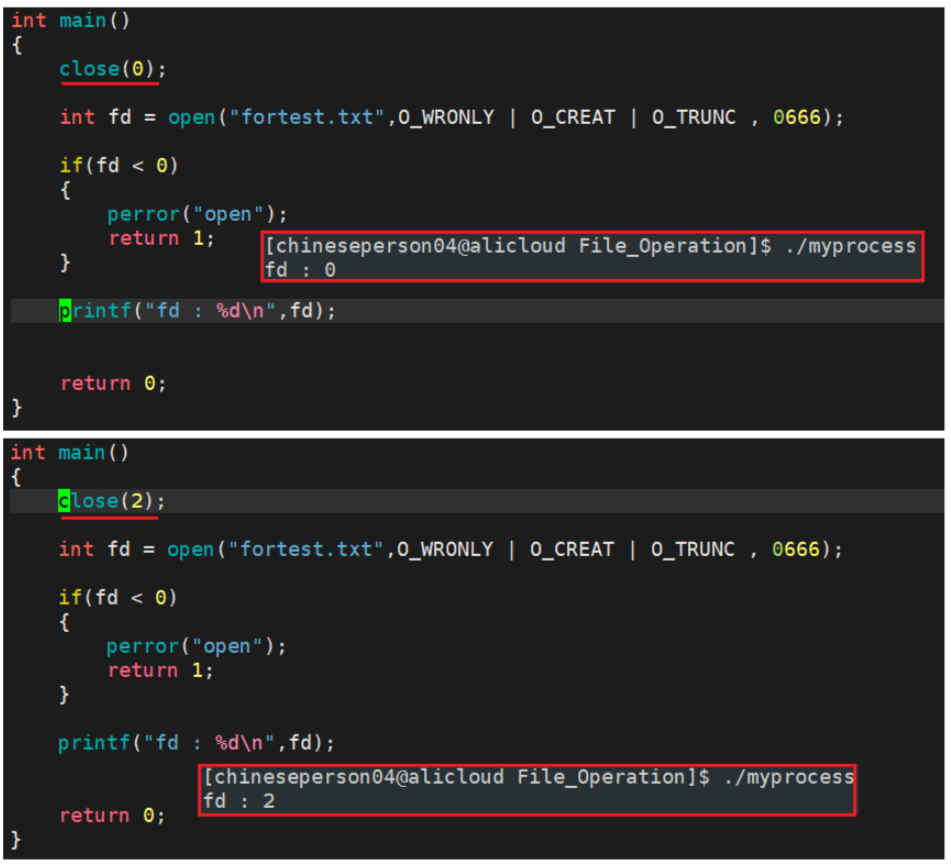 下面的代码中,我们分别将文件标识符为0和2的文件关闭后,在新打开一个文件,我们发现新打开文件的文件描述符确实分别为0和2,符合fd的分配规则。