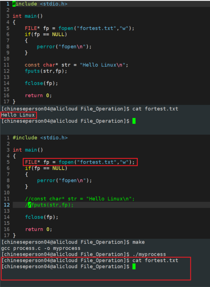 - 接下来我们使用./myprocess > fortest.txt 2>&1将标准输入和标准错误都重定向到文件中,查看文件发现确实都写进去了,一个命令就可以是标准输入和标准输出都重定向到一个文件中,那么我们也可以使用一个命令将标准输入和标准输出分别重定向到两个不同的文件中,通过下图发现也确实分别将信息写入到了两个文件中,到这里就能就是标准错误存在的原因了,标准错误的存在就可以将标准信息和错误信息分别写入到两个文件中,这样可以方便我们查看错误信息,方便排查代码错误。