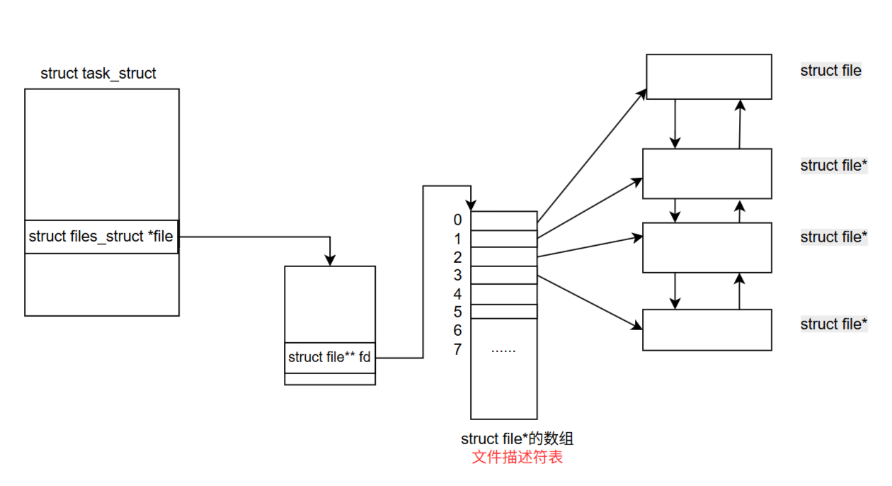 - 操作系统不希望进程和文件的耦合度太高了,所以为进程创建了一个文件描述符表,这个表中可以存储文件结构体对象的地址,通过文件描述符表将进程与文件联系起来。
