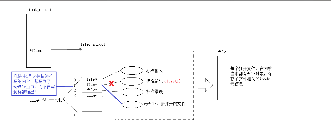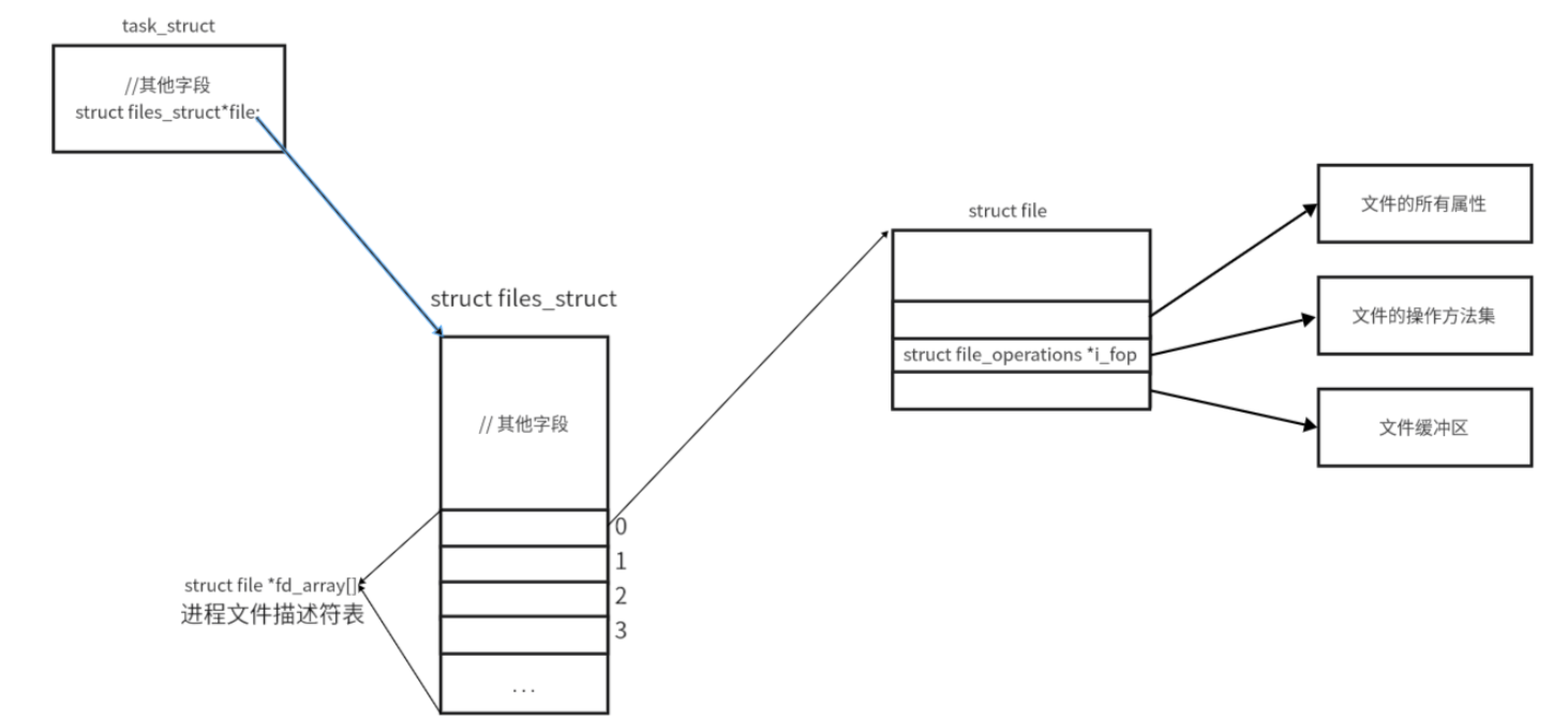当一个进程运行时,操作系统会为其创建一个task_struct,操作系统还会为每个进程创建一个files_struct,files_struct中有一个进程文件描述符表,文件描述符表中有一个数组用来存储被打开文件的结构体对象的地址,结构体对象中有一个字段是用来指向文件所有属性的,有一个字段是用来指向文件的操作方法集的,还有个字段是用来指向文件缓冲区的。