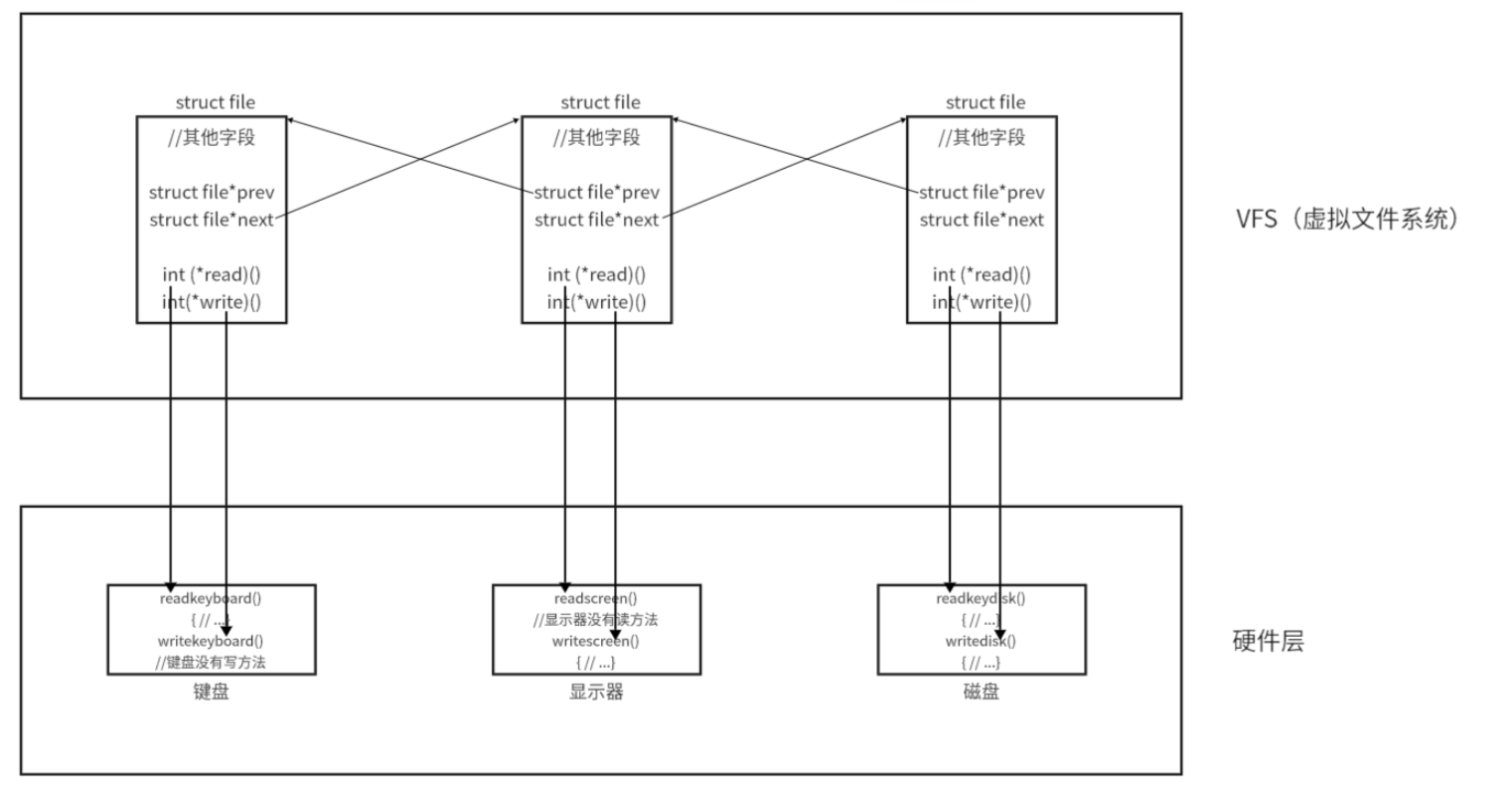 在硬件层中,每一个硬件至少会有读/写的方法,并且每个硬件的读写方法都不可能相同,在操作系统打开硬件的时候,会为其创建一个结构体对象,这个对象中存在两个函数指针,用于指向硬件的读写方法,当我们想调用硬件的读写方法时,可以通过函数指针来调用,而不是通过底层的读写方式来调用,那么就完成了对硬件读写操作的统一。