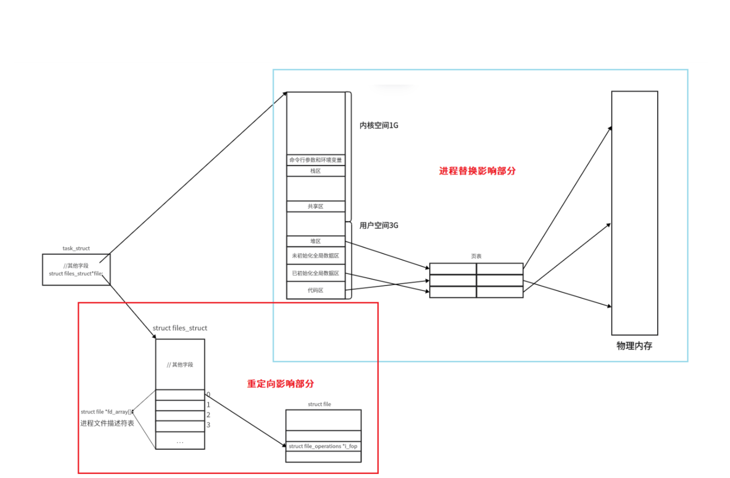 首先给出结论重定向与进程替换之间是不会互相影响的,重定向影响的是进程的文件描述符表和文件结构体对象,而进程替换影响的是进程的进程地址空间、进程的页表和物理内存,所以重定向与进程替换之间是不会互相影响的。