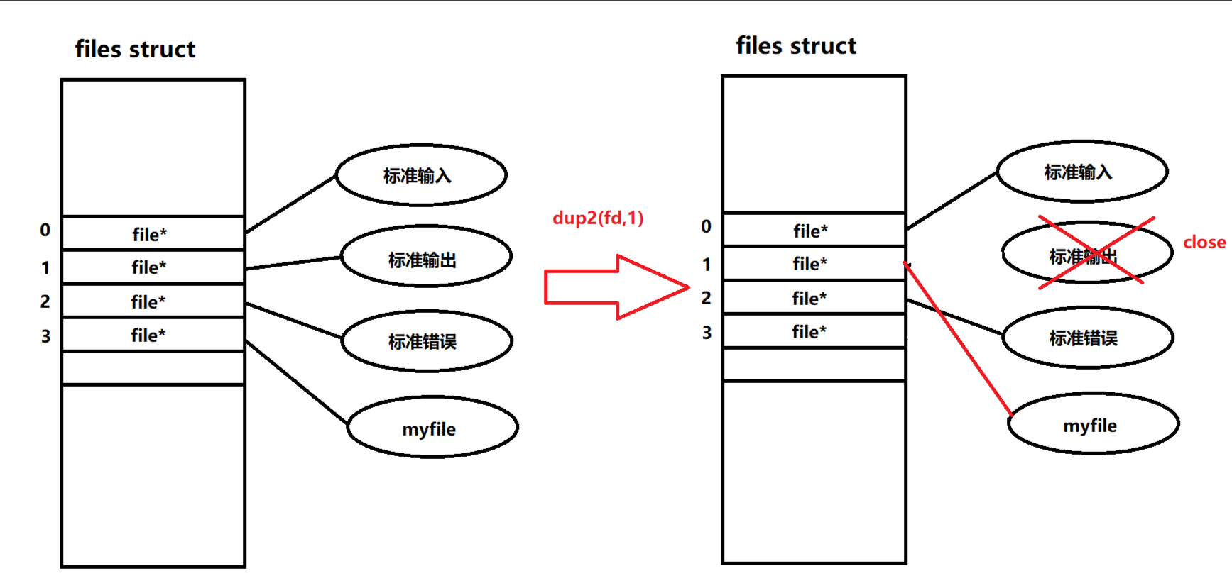 - 文件描述符的规则就是遍历文件描述符表中的数组,寻找数组中下标最小且该位置没有被使用的位置,用来分配给指定的被打开文件。