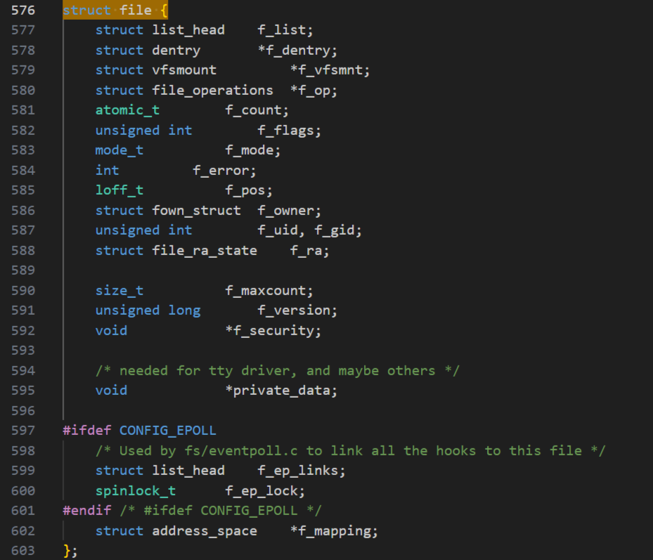 - 该结构体又包含其他很多的结构体,其中struct list_head f_list是用来记录所有系统打开的文件,